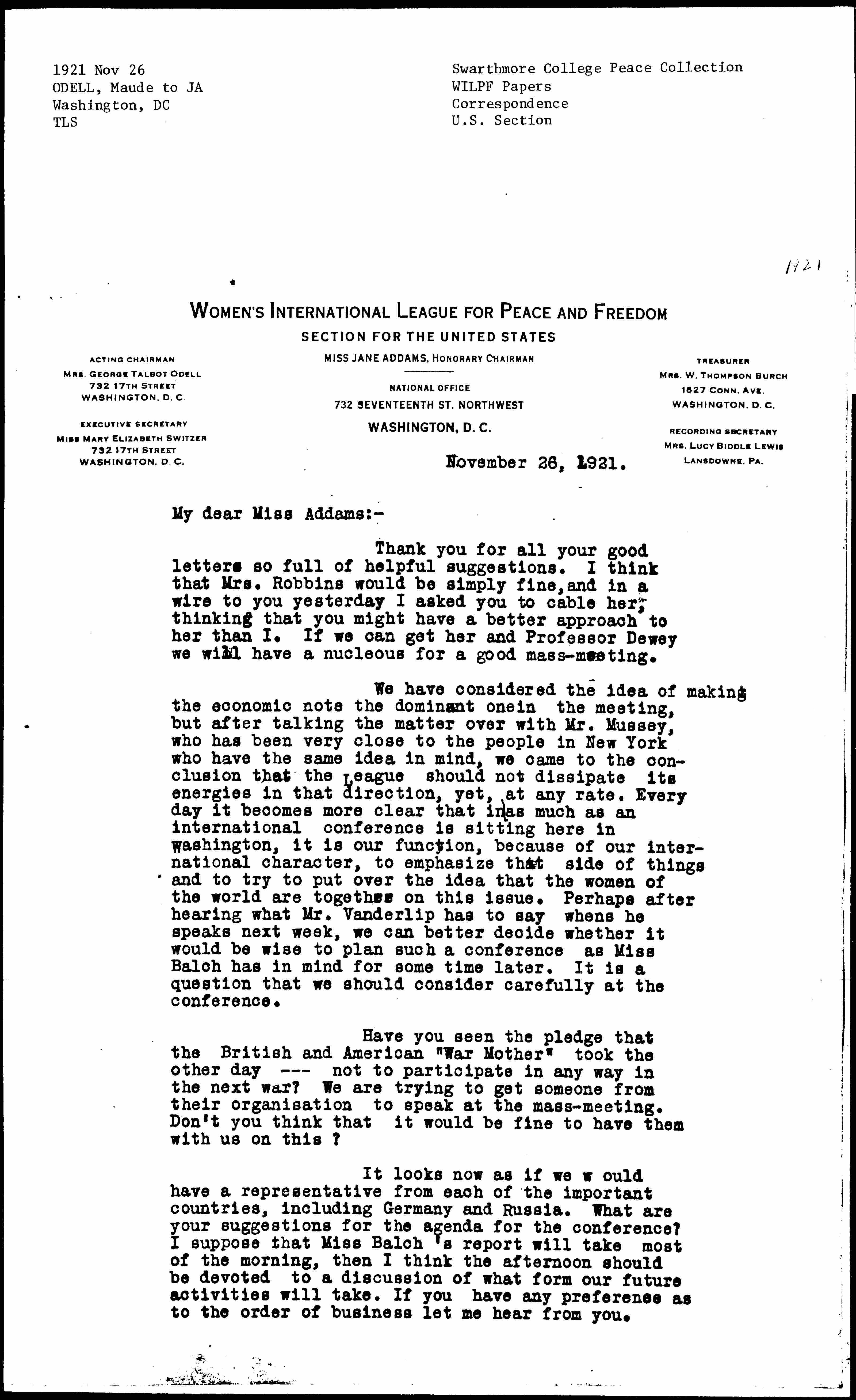 We have considered the idea of making the economic note the dominant one in the meeting, but after talking the matter over with Mr. Mussey, who has been very close to the people in New York who have the same idea in mind, we came to the conclusion that the League should not dissipate its energies in that direction, yet, at any rate. Every day it becomes more clear that in as much as an international conference is sitting here in Washington, it is our function, because of our international character, to emphasize that side of things and to try to put over the idea that the women of the world are together on this issue. Perhaps after hearing what Mr. Vanderlip has to say [when] he speaks next week, we can better decide whether it would be wise to plan such a conference as Miss Balch has in mind for some time later. It is a question that we should consider carefully at the conference.