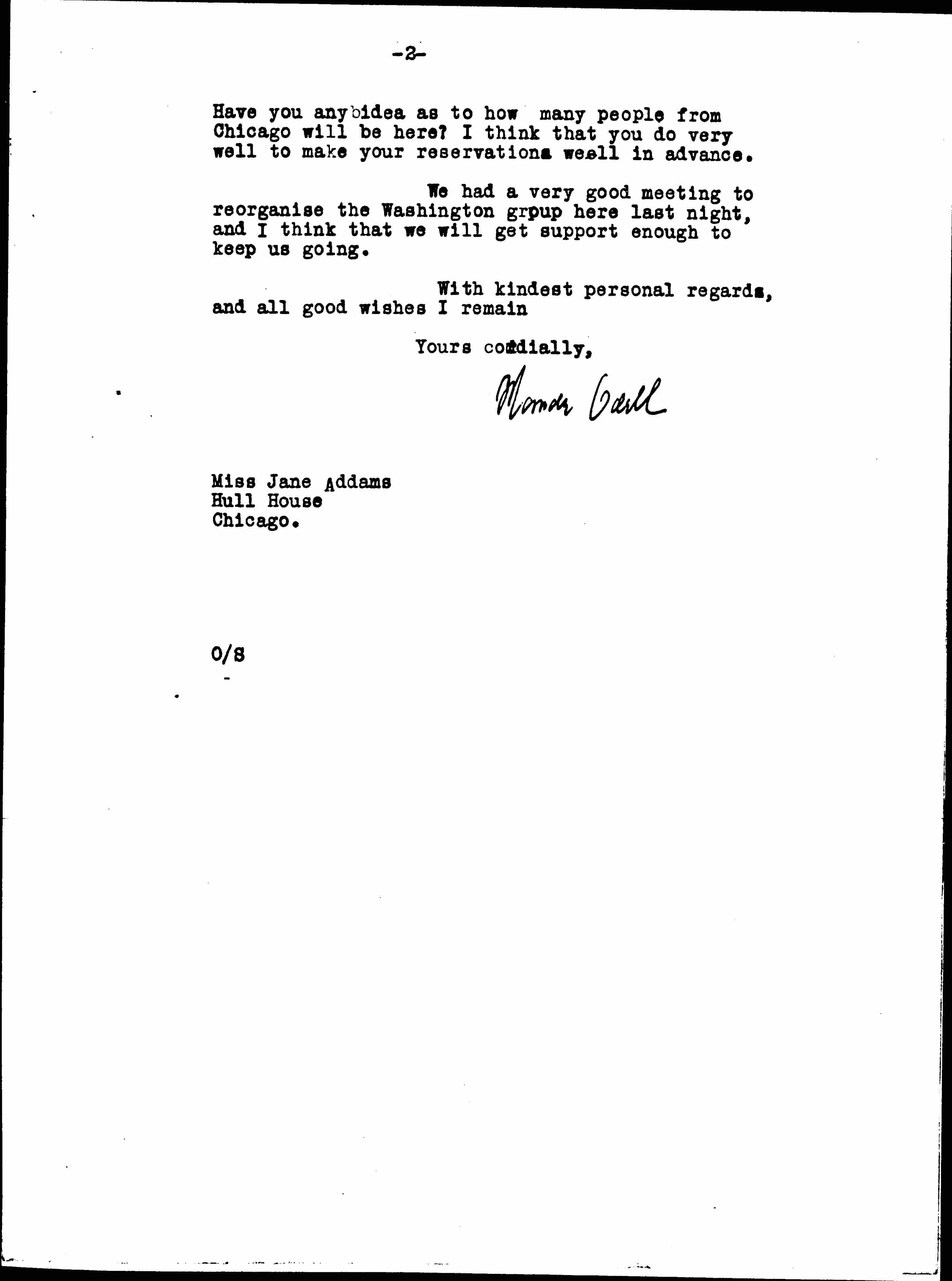 It looks now as if we would have a representative from each of the important countries, including Germany and Russia. What are your suggestions for the agenda for the conference? I suppose that Miss Balch's report will take most of the morning, then I think the afternoon should be devoted to a discussion of what form our future activities will take. If you have any preference as to the order of business let me hear from you. [page 2]