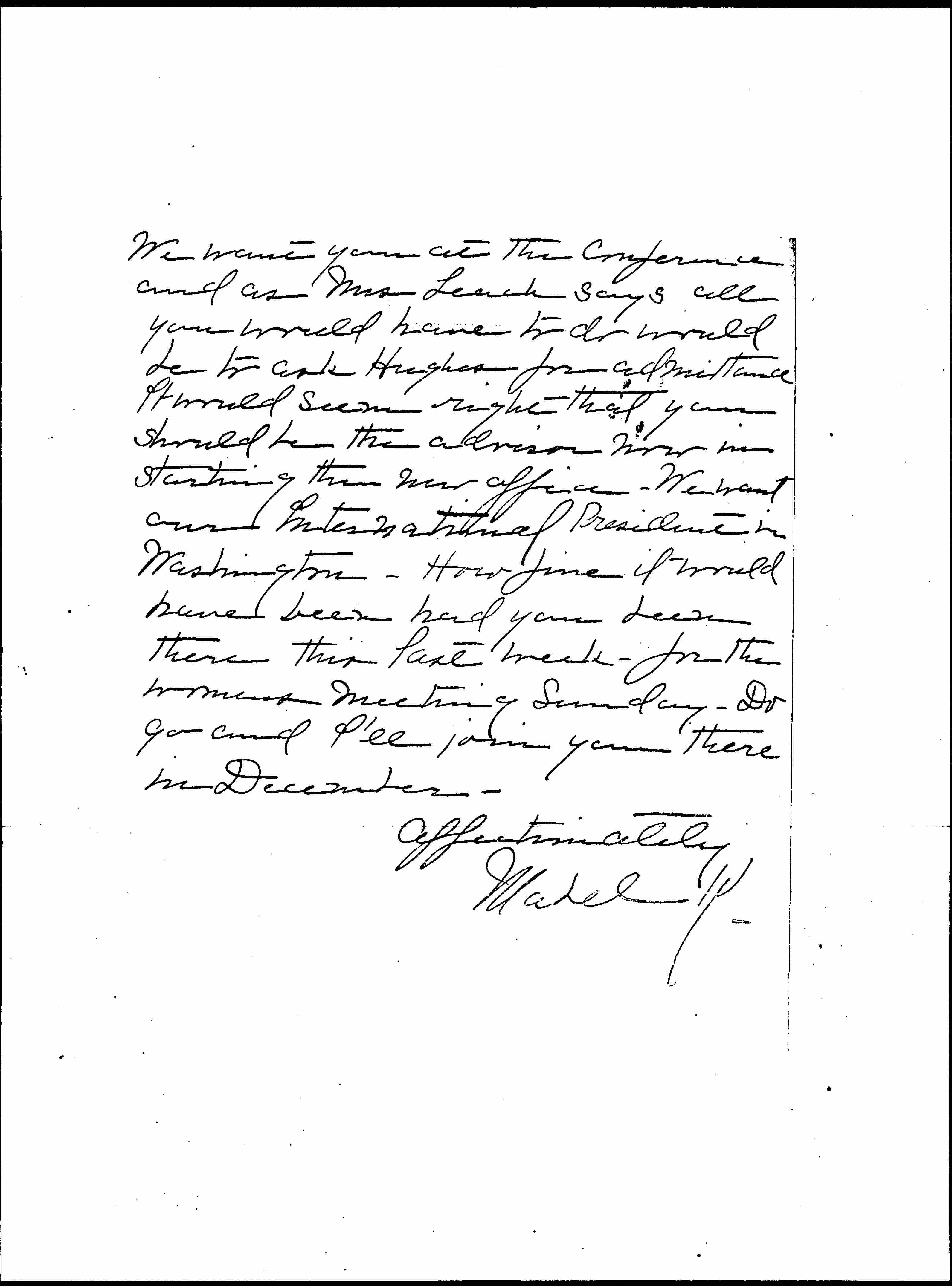 What we do all want is that you should go to Washington now. [page 2] We want you at the Conference and as Mrs Leach says all you would have to do would be to ask Hughes for admittance. It would seem right that you should be the advisor now in starting the new office. We want our International President in Washington. How fine it would have been had you been there this past week, for the women's meeting Sunday. Do go and I'll join you there in December.