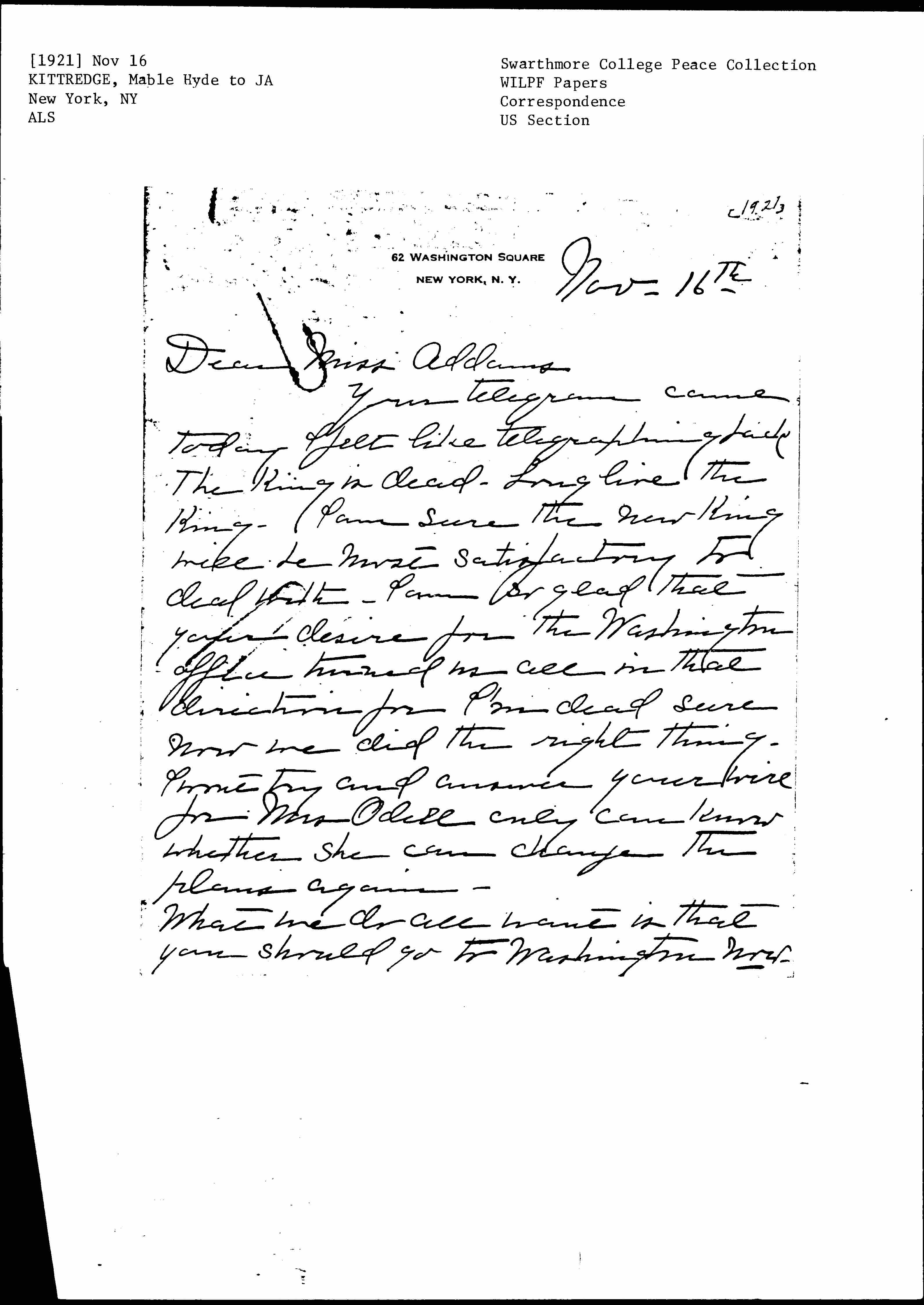 Your telegram came today -- I felt like telegraphing back The King is dead. Long live the King. I am sure the new King will be most satisfactory to deal with. I am so glad that your desire for the Washington office turned us all in that direction for I'm dead sure now we did the right thing. I won't try and answer your wire for Mrs Odell only can know whether she can change the plans again.