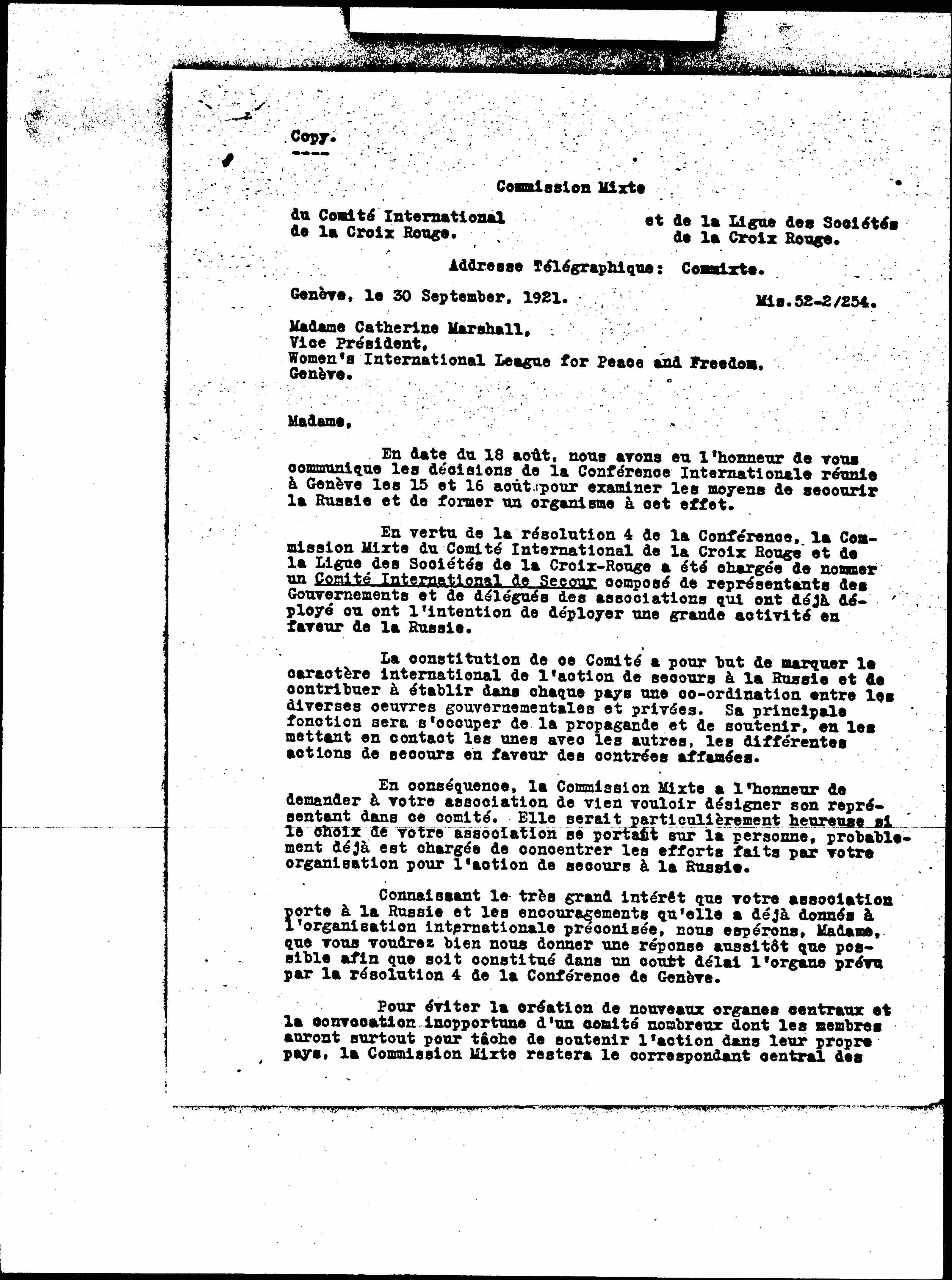Knowing the great interest that your association has in Russia and the encouragement it has already given to the recommended international organization, we hope, Madam, that you will kindly give us an answer as soon as possible so that it may be formed in a [illegible] delay the organ provided for by resolution 4 of the Geneva Conference.