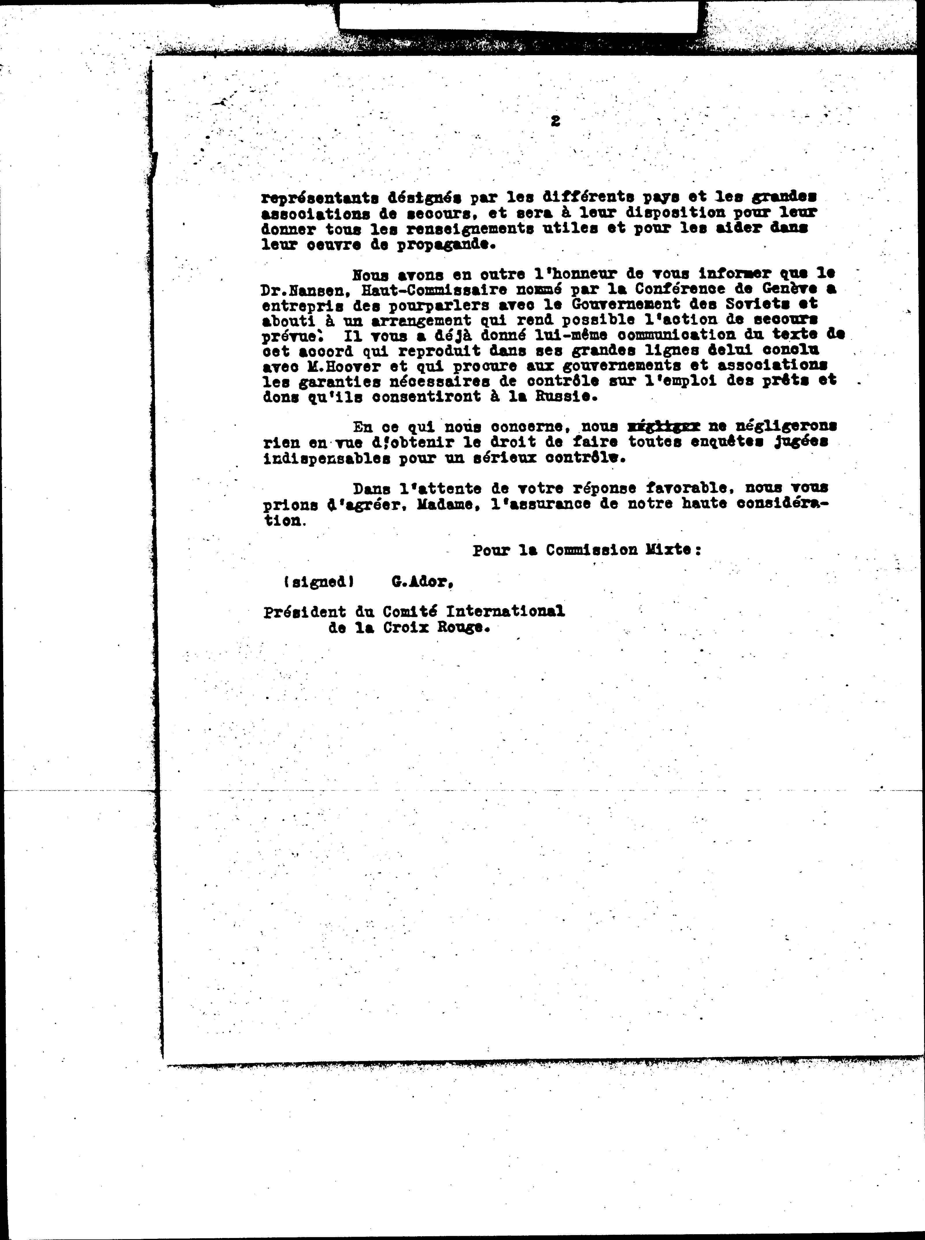 Consequently, the Mixed Commission has the honor to ask your association to come to appoint its representative in this committee. She would be particularly happy if the choice of your association focusing on the person, probably already is responsible for concentrating the efforts made by your organization for relief action in Russia.