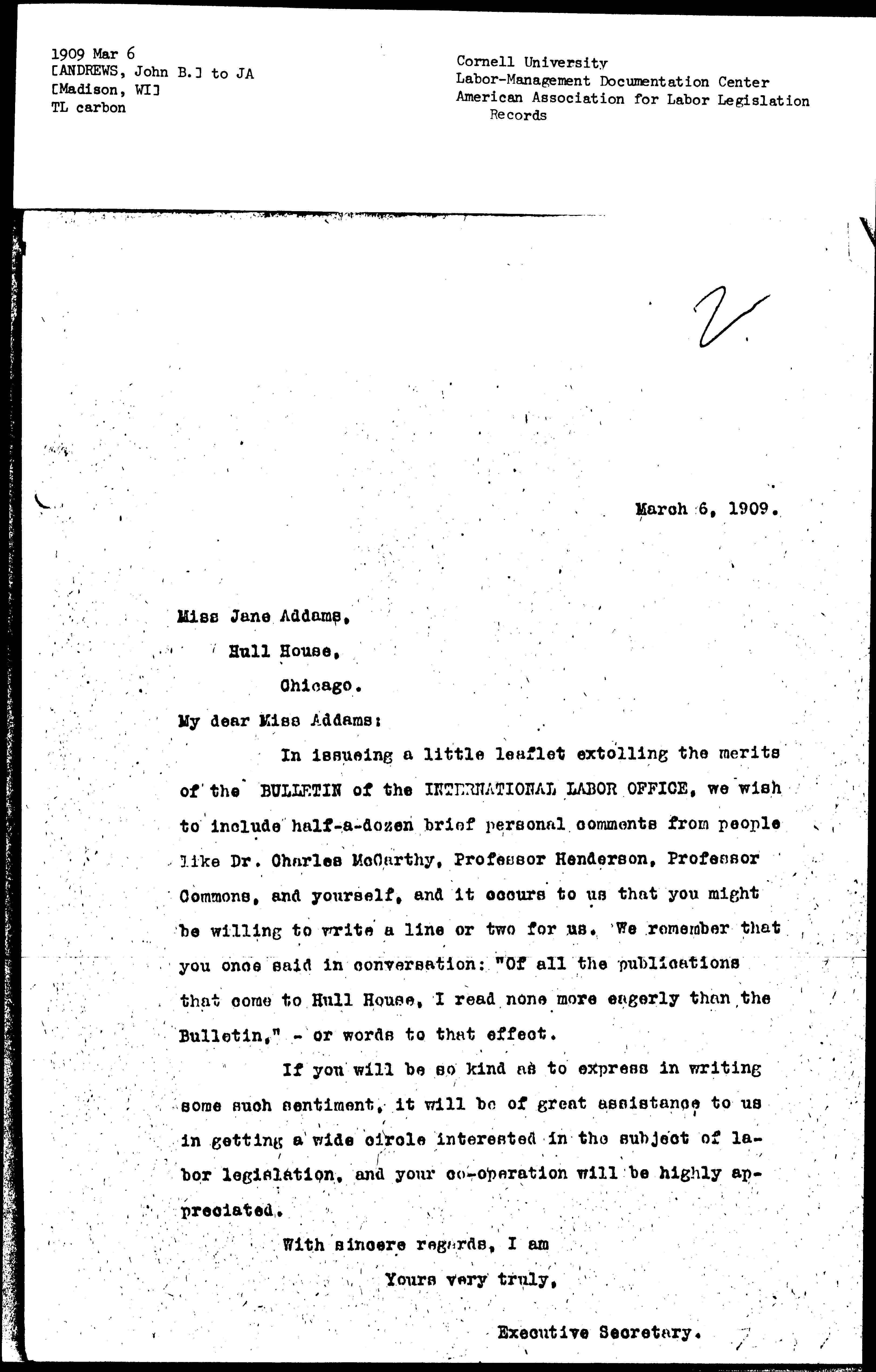 In issuing a little leaflet extolling the merits of the BULLETIN of the INTERNATIONAL LABOR OFFICE, we wish to include half-a-dozen brief personal comments from people like Dr. Charles McCarthy, Professor Henderson, Professor Commons, and yourself, and it occurs to us that you might be willing to write a line or two for us. We remember that you once said in conversation: "Of all the publications that come to Hull House, I read none more eagerly than the Bulletin," -- or words to that effect.