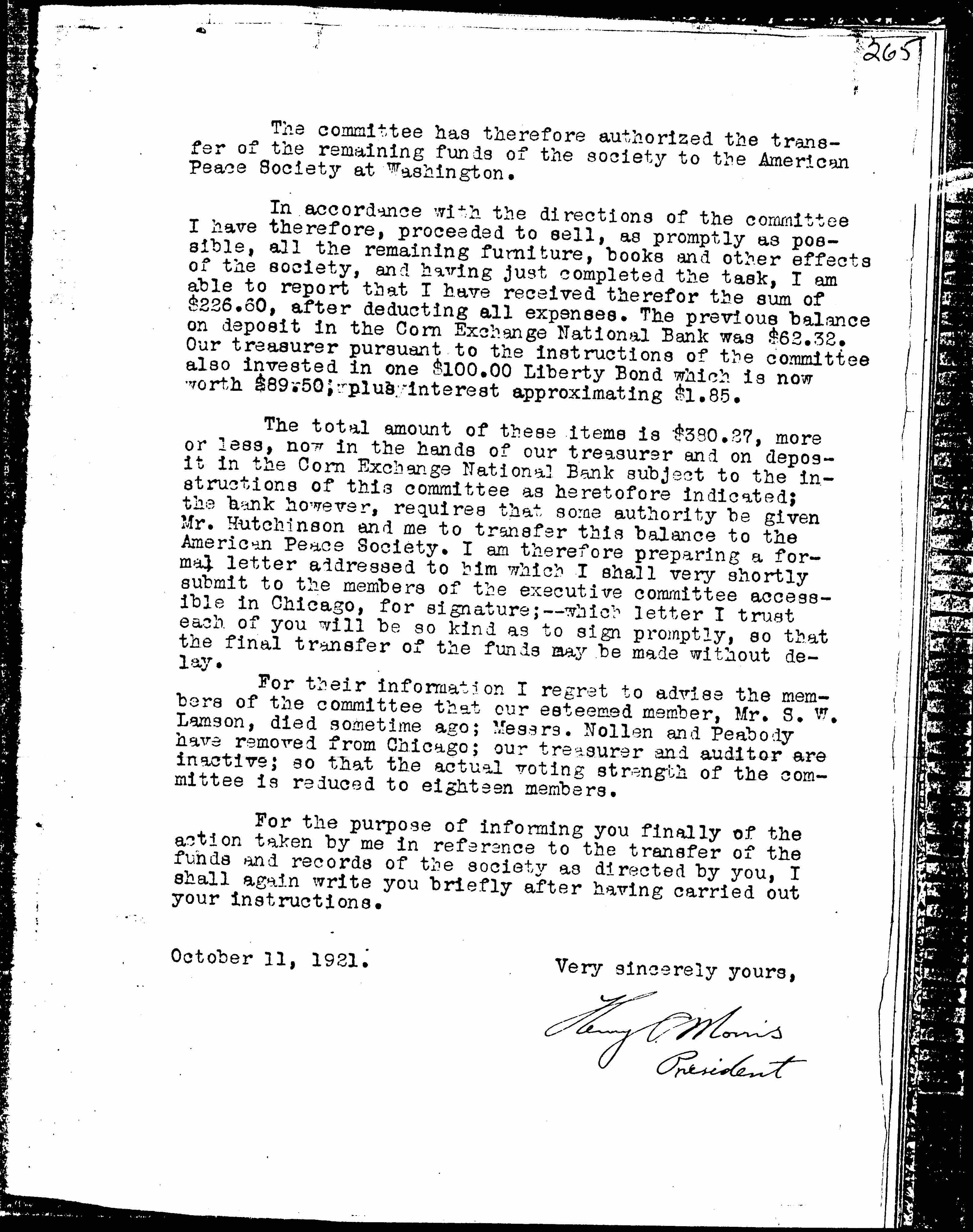 The total amount of these items is $380.27, more or less, now in the hands of our treasurer and on deposit in the Corn Exchange National Bank subject to the instructions of this committee as heretofore indicated; the bank however, requires that some authority be given Mr. Hutchinson and me to transfer this balance to the American Peace Society. I am therefore preparing a formal letter addressed to him which I shall very shortly submit to the members of the executive committee accessible in Chicago, for signature; -- which letter I trust each of you will be so kind as to sign promptly, so that the final transfer of the funds may be made without delay.