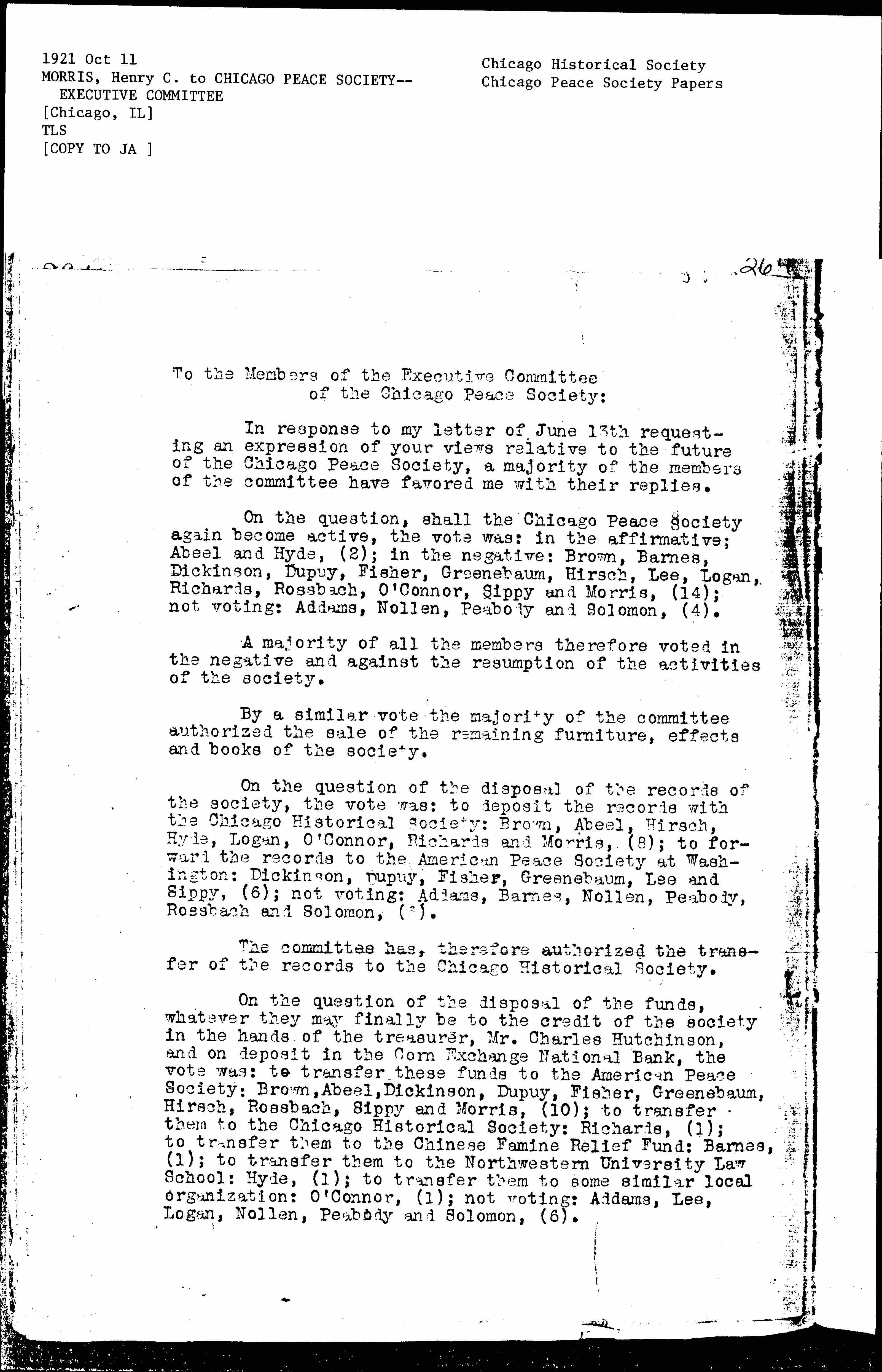On the question of the disposal of the funds, whatever they may finally be to the credit of the society in the hands of the treasurer, Mr. Charles Hutchinson, and on deposit in the Corn Exchange National Bank, the vote was: to transfer these funds to the American Peace Society: Brown, Abeel, Dickinson, Dupuy, Fisher, Greenebaum, Hirsch, Rossbach, Sippy and Morris, (10); to transfer them to the Chicago Historical Society: Richards, (1); to transfer them to the Chinese Famine Relief Fund: Barnes, (1); to transfer them to the Northwestern University Law School: Hyde (1); to transfer them to some similar local organization: O'Connor, (1); not voting: Addams, Lee, Logan, Nollen, Peabody and Solomon, (6). [page 2]