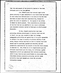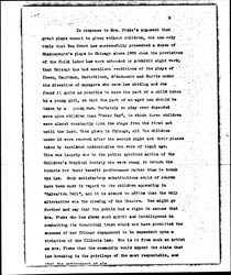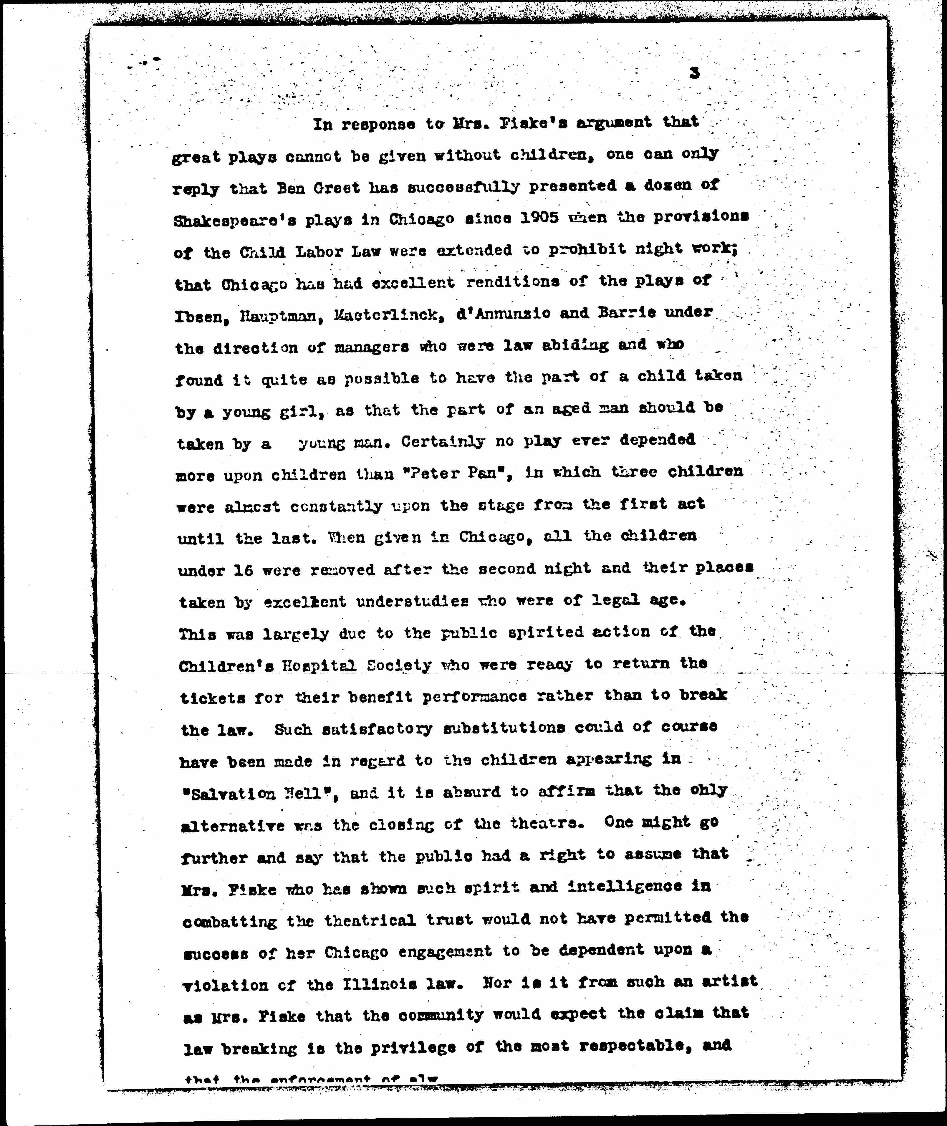 In response to Mrs. Fiske's argument that great plays cannot be given without children, one can only reply that Ben Greet has successfully presented a dozen of Shakespeare's plays in Chicago since 1905 when the provisions of the Child Labor Law were extended to prohibit night work; that Chicago has had excellent renditions of the plays of Ibsen, [Hauptmann], Maeterlinck, d'Annunzio and Barrie under the direction of managers who were law abiding and who found it quite as possible to have the part of a child taken by a young girl, as that the part of an aged man should be taken by a young man. Certainly no play ever depended more upon children than "Peter Pan", in which three children were almost constantly upon the stage from the first act until the last. When given in Chicago, all the children under 16 were removed after the second night and their places taken by excellent understudies who were of legal age.This was largely due to the public spirited action of the Children's Hospital Society who were ready to return the tickets for their benefit performance rather than to break the law. Such satisfactory substitutions could of course have been made in regard to the children appearing in "Salvation Nell", and it is absurd to affirm that the only alternative was the closing of the theatre. One might go further and say that the public had a right to assume that Mrs. Fiske who has shown much spirit and intelligence in combatting the theatrical trust would not have permitted the success of her Chicago engagement to be dependent upon a violation of the Illinois law. Nor is it from such an artist as Mrs. Fiske that the community would expect the claim that law breaking is the privilege of the most respectable, and that the enforcement of law [page 4] should be limited to the less fortunate and to the less gifted.