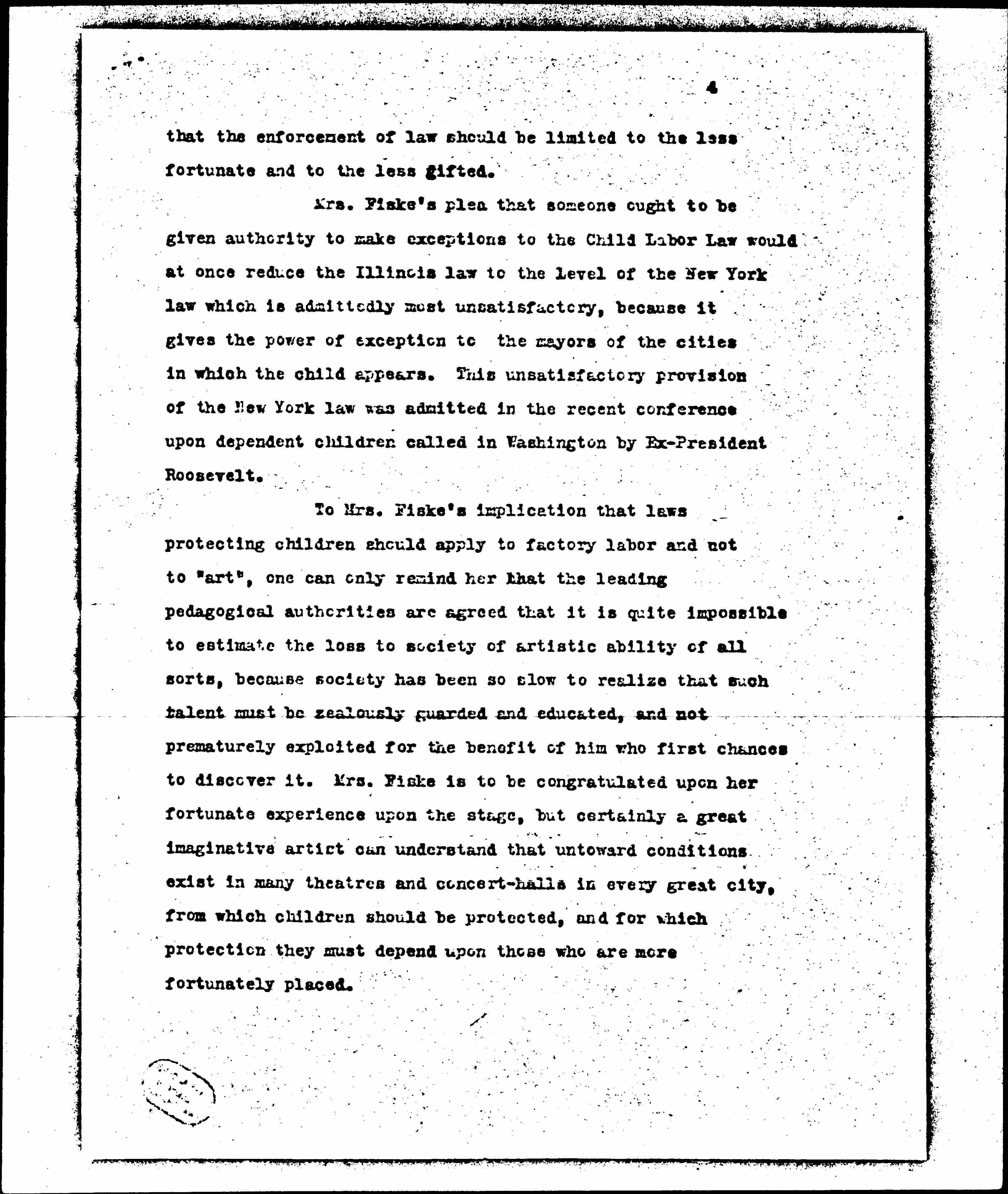To Mrs. Fiske's implication that laws protecting children should apply to factory labor and not to "art", one can only remind her that the leading pedagogical authorities are agreed that it is quite impossible to estimate the loss to society of artistic ability of all sorts, because society has been so slow to realize that such talent must be zealously guarded and educated, and not prematurely exploited for the benefit of him who first chances to discover it. Mrs. Fiske is to be congratulated upon her fortunate experience upon the stage, but certainly a great imaginative artist can understand that untoward conditions exist in many [theaters] and concert-halls in every great city, from which children should be protected, and for which protection they must depend upon those who are more fortunately placed.
