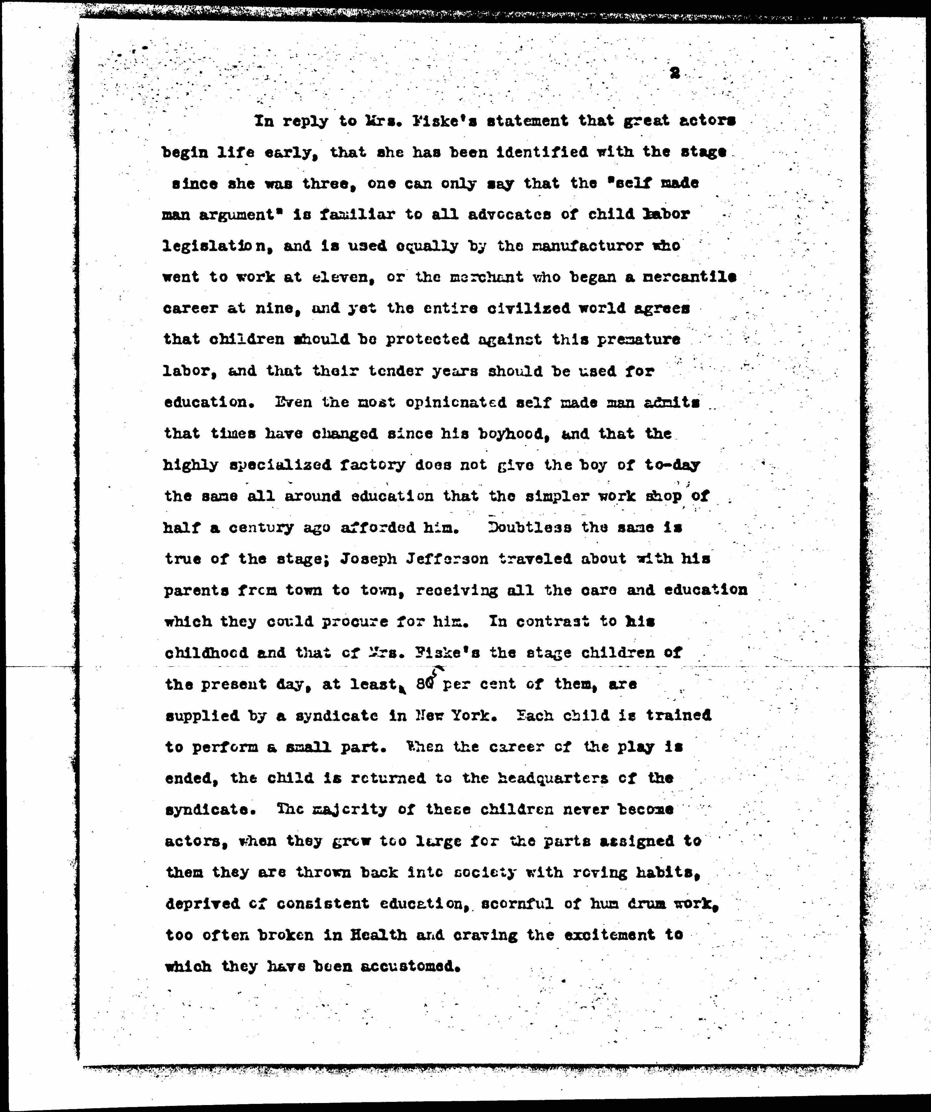 In reply to Mrs. Fiske's statement that great actors begin life early, that she has been identified with the stage since she was three, one can only say that the "self made man argument" is familiar to all advocates of child labor legislation, and is used equally by the [manufacturer] who went to work at eleven, or the merchant who began a mercantile career at nine, and yet the entire civilized world agrees that children should be protected against this premature labor, and that their tender years should be used for education. Even the most opinionated self made man admits that times have changed since his boyhood, and that the highly specialized factory does not give the boy of [today] the same all around education that the simpler work shop of half a century ago afforded him. Doubtless the same is true of the stage; Joseph Jefferson traveled about with his parents from town to town, receiving all the care and education which they could procure for him. In contrast to his childhood and that of Mrs. Fiske's the stage children of the present day, at least 80 ↑85↓ per cent of them, are supplied by a syndicate in New York. Each child is trained to perform a small part. When the career of the play is ended, the child is returned to the headquarters of the syndicate. The majority of these children never become actors, when they grow too large for the parts assigned to them they are thrown back into society with roving habits, deprived of consistent education, scornful of [humdrum] work, too often broken in Health and craving the excitement to which they have been accustomed. [page 3]