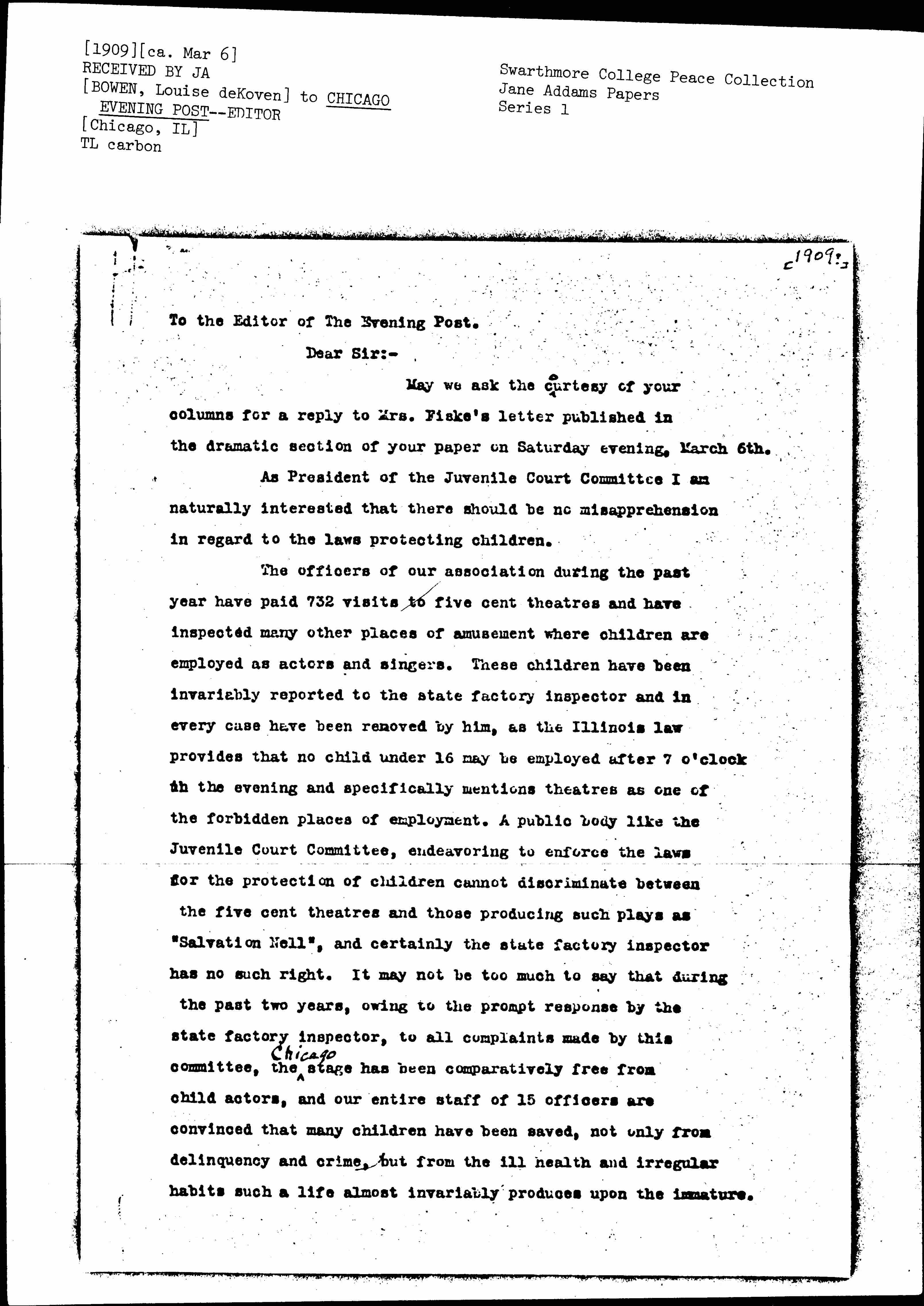 The officers of our association during the past year have paid 732 visits to five cent theaters and have inspected many other places of amusement where children are employed as actors and singers. These children have been invariably reported to the state factory inspector and in every case have been removed by him, as the Illinois law provides that no child under 16 may be employed after 7 o'clock in the evening and specifically mentions theaters as one of the forbidden places of employment. A public body like the Juvenile Court Committee, endeavoring to enforce the laws for the protection of children cannot discriminate between the five cent theaters and those producing such plays as "Salvation Nell", and certainly the state factory inspector has no such right. It may not be too much to say that during the past two years, owing to the prompt response by the state factory inspector, to all complaints made by this committee, the ↑Chicago↓ stage has been comparatively free from child actors, and our entire staff of 15 officers are convinced that many children have been saved, not only from delinquency and crime, but from the ill health and irregular habits such a life almost invariably produces upon the immature. [page 2]