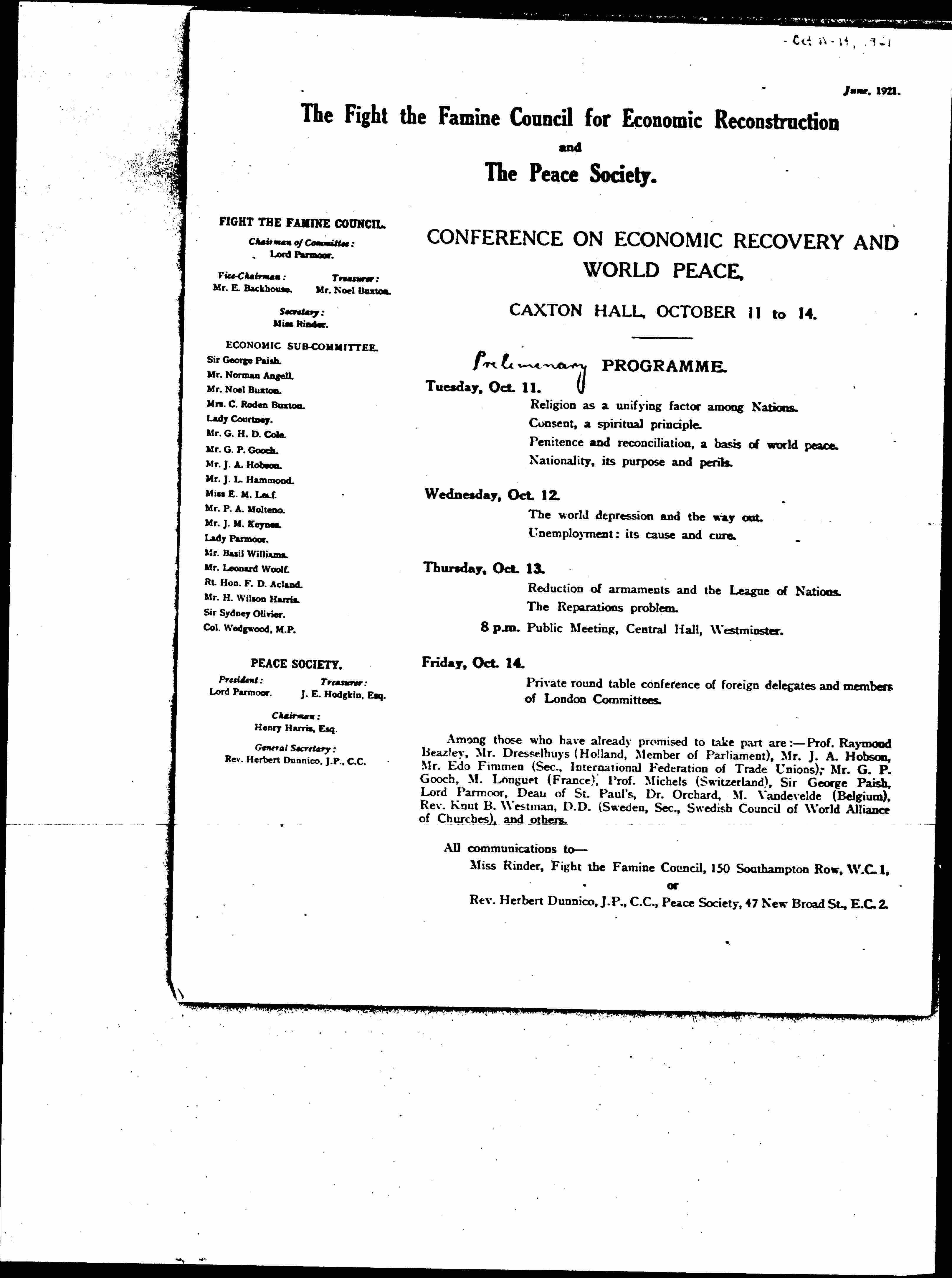 Among those who have already promised to take part are: -- Prof. Raymond Beazley, Mr. Dresselhuys (Holland, Member of Parliament), Mr. J. A. Hobson, Mr. Edo Fimmen (Sec., International Federation of Trade Unions), Mr. G. P. Gooch, M. Longuet (France), Prof. Michels (Switzerland), Sir George Paish, Lord Parmoor, Dean of St. Paul's, Dr. Orchard, M. Vandevelde (Belgium), Rev. Knut B. Westman, D.D. (Sweden, Sec., Swedish Council of World Alliance of Churches), and others.