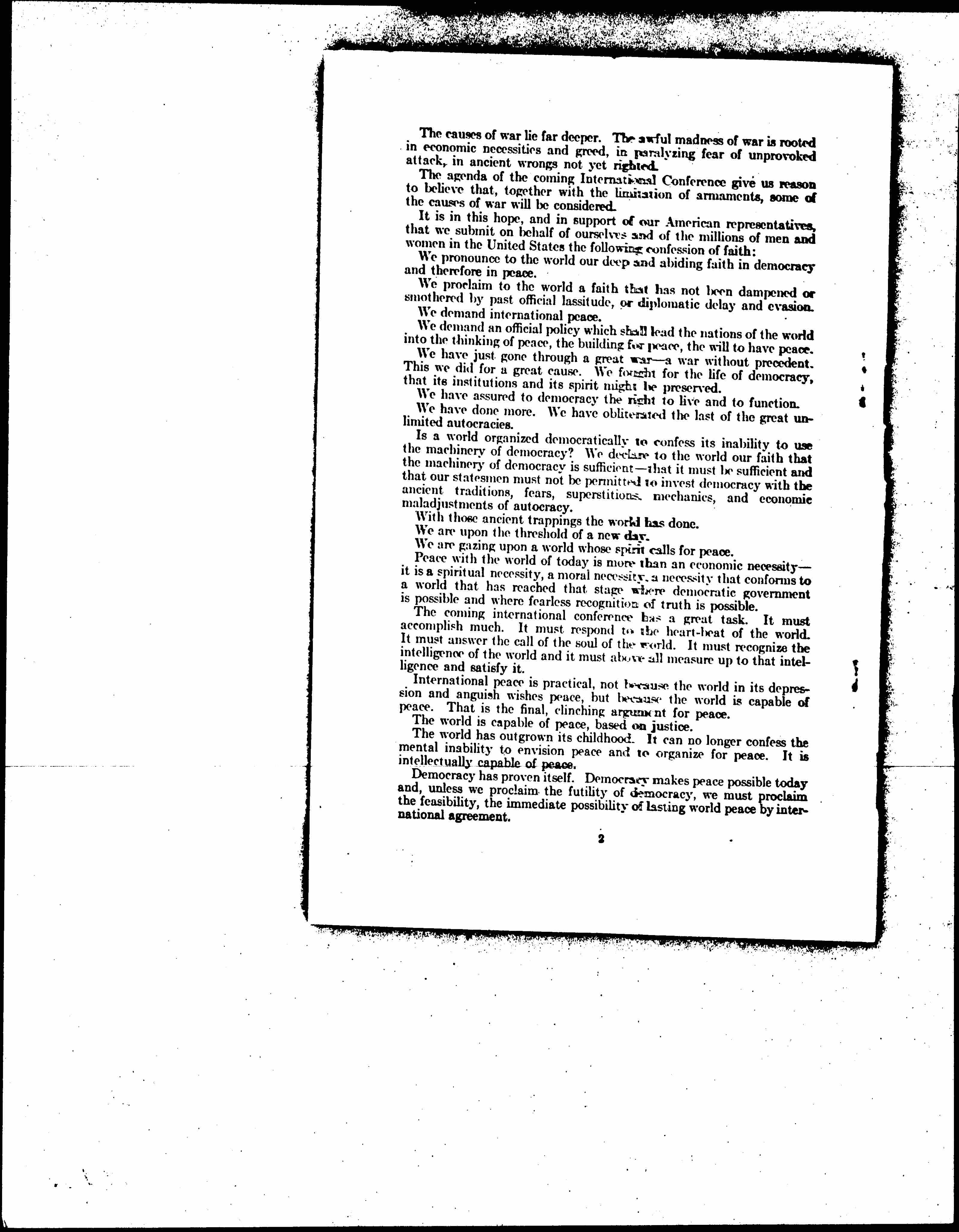 We pronounce to the world our deep and abiding faith in democracy and therefore in peace.