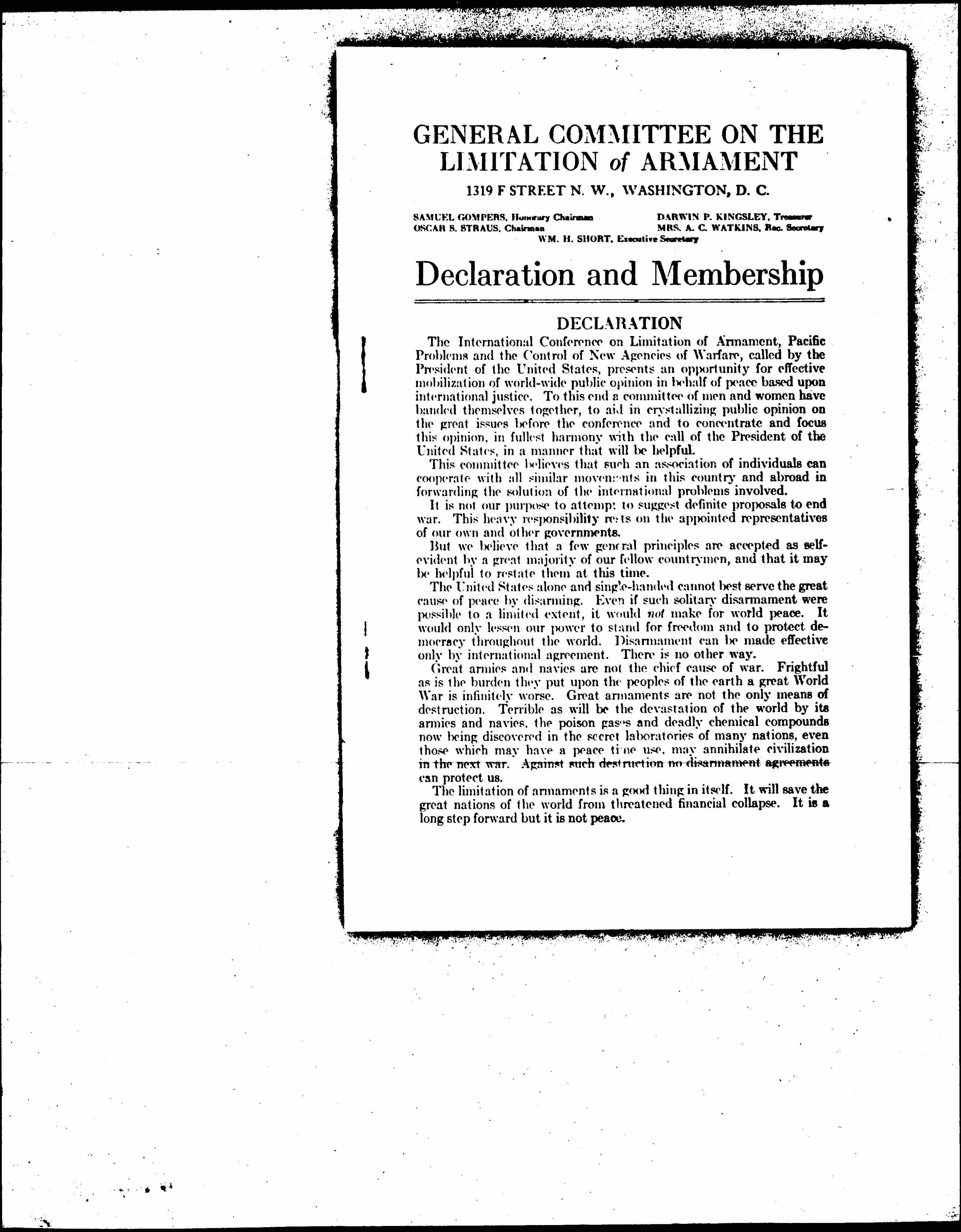 The International Conference on Limitation of Armament, Pacific Problems and the Control of New Agencies of Warfare, called by the President of the United States, presents an opportunity for effective mobilization of world-wide public opinion in behalf of peace based upon international justice. To this end a committee of men and women have banded themselves together, to aid in crystallizing public opinion on the great issues before the conference and to concentrate and focus this opinion, in fullest harmony with the call of the President of the United states, in a manner that will be helpful.