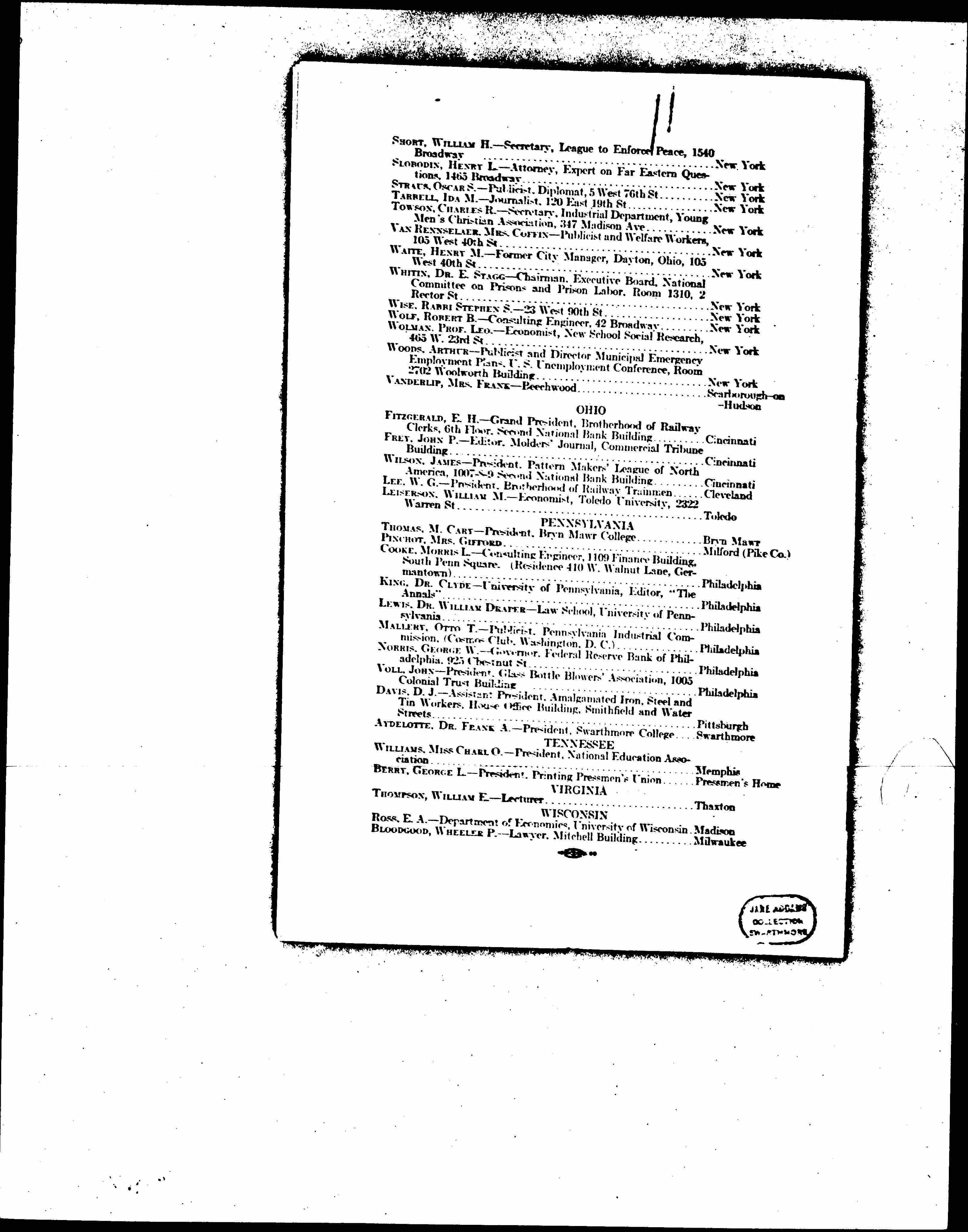 SHORT, WILLIAM H. -- Secretary, League to Enforce Peace, 1540 Broadway ... New York