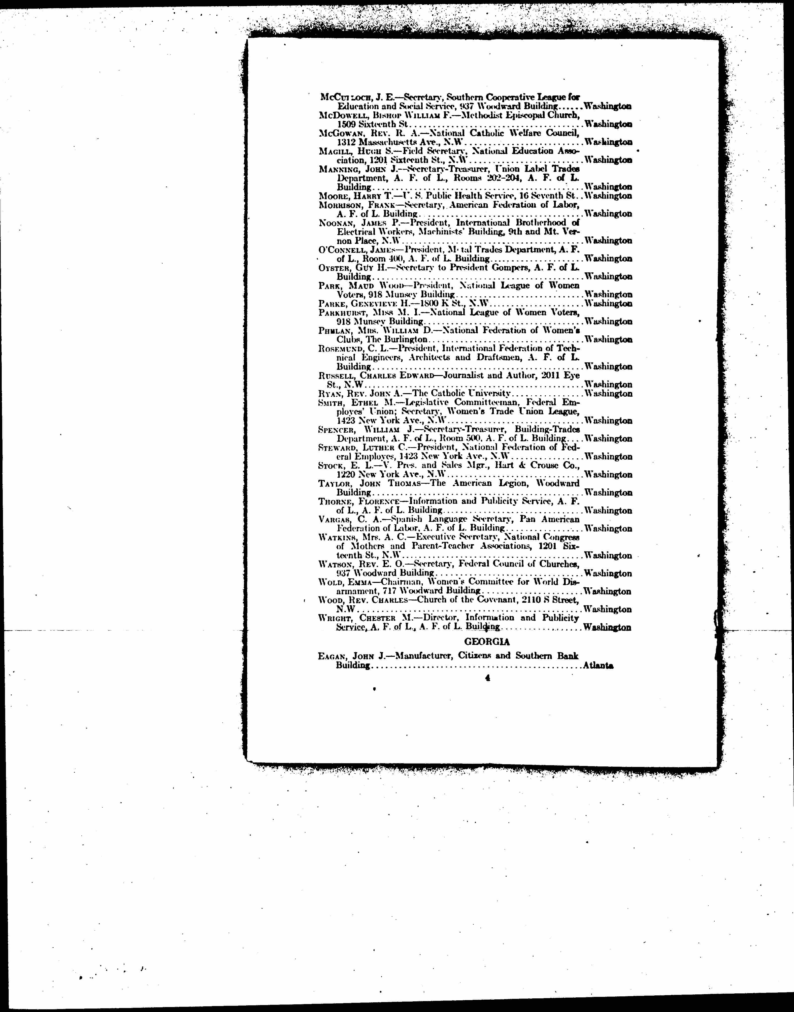 WATSON, REV. E. O. -- Secretary, Federal Council of Churches, 937 Woodward Building ... Washington