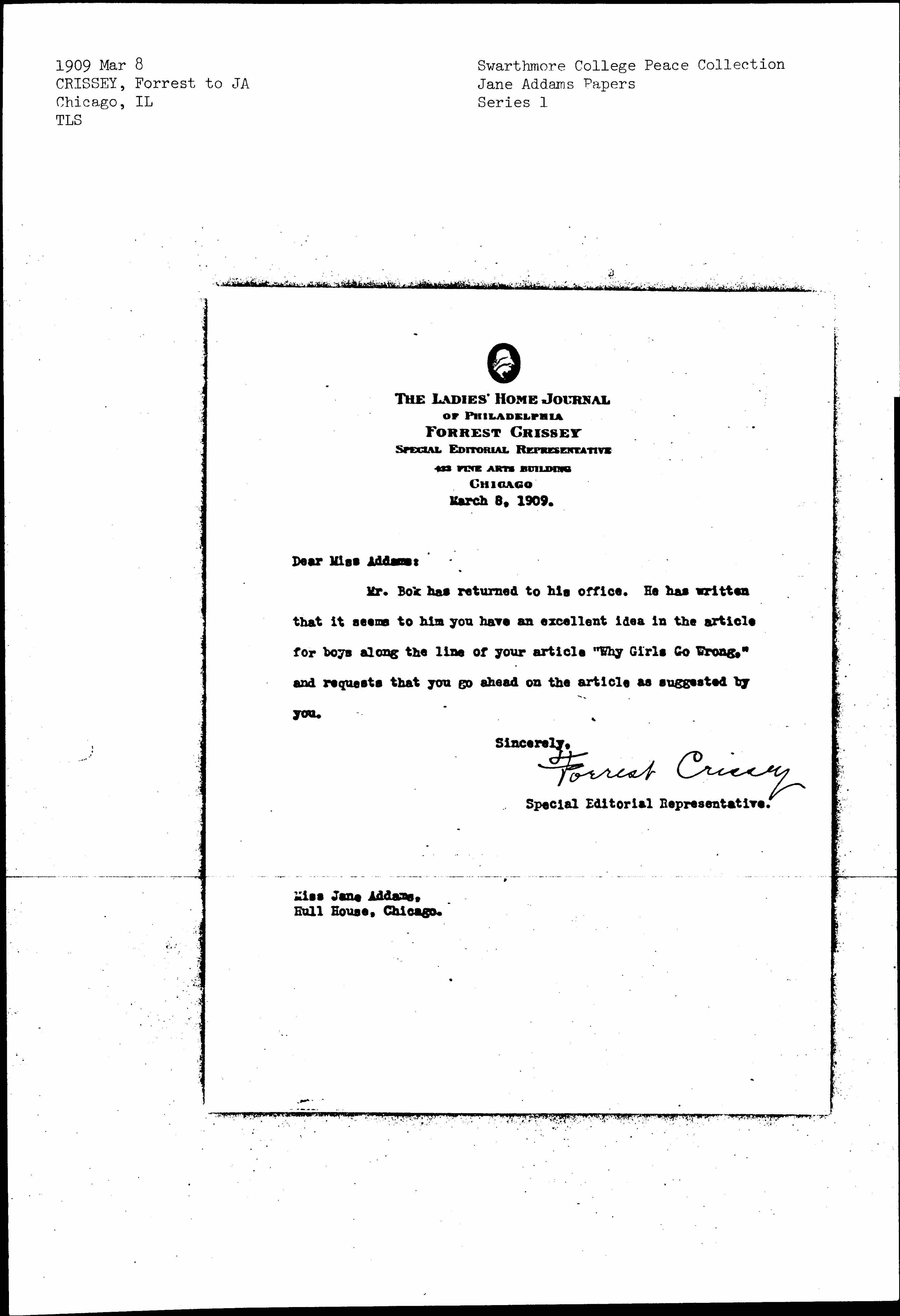 Mr. Bok has returned to his office. He has written that it seems to him you have an excellent idea in the article for boys along the line of your article "Why Girls Go Wrong," and requests that you go ahead on the article as suggested by you.