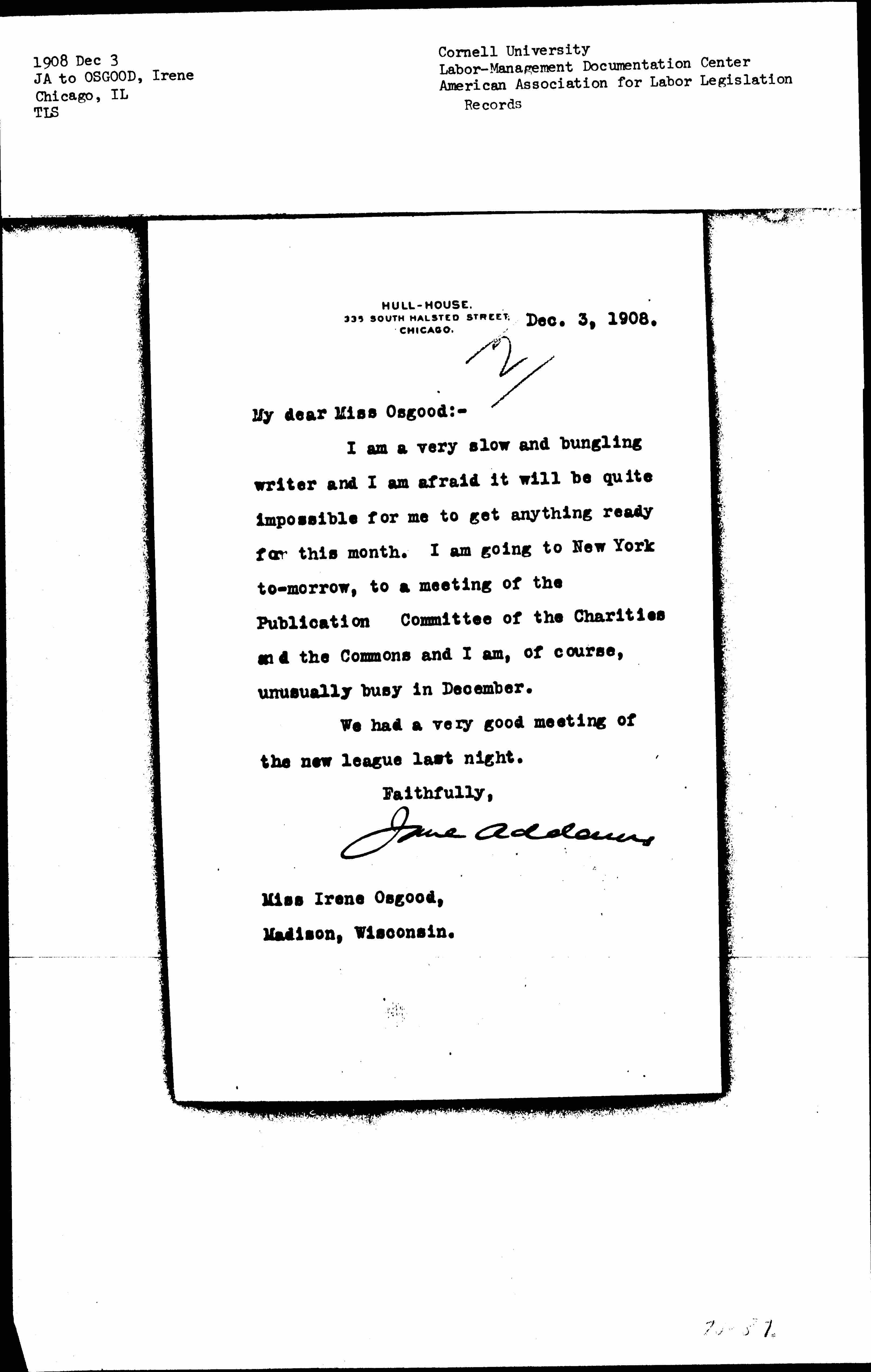 I am very slow and bungling writer and I am afraid it will be quite impossible for me to get anything ready for this month. I am going to New York [tomorrow], to a meeting of the Publication Committee of the Charities and the Commons and I am, of course, unusually busy in December.