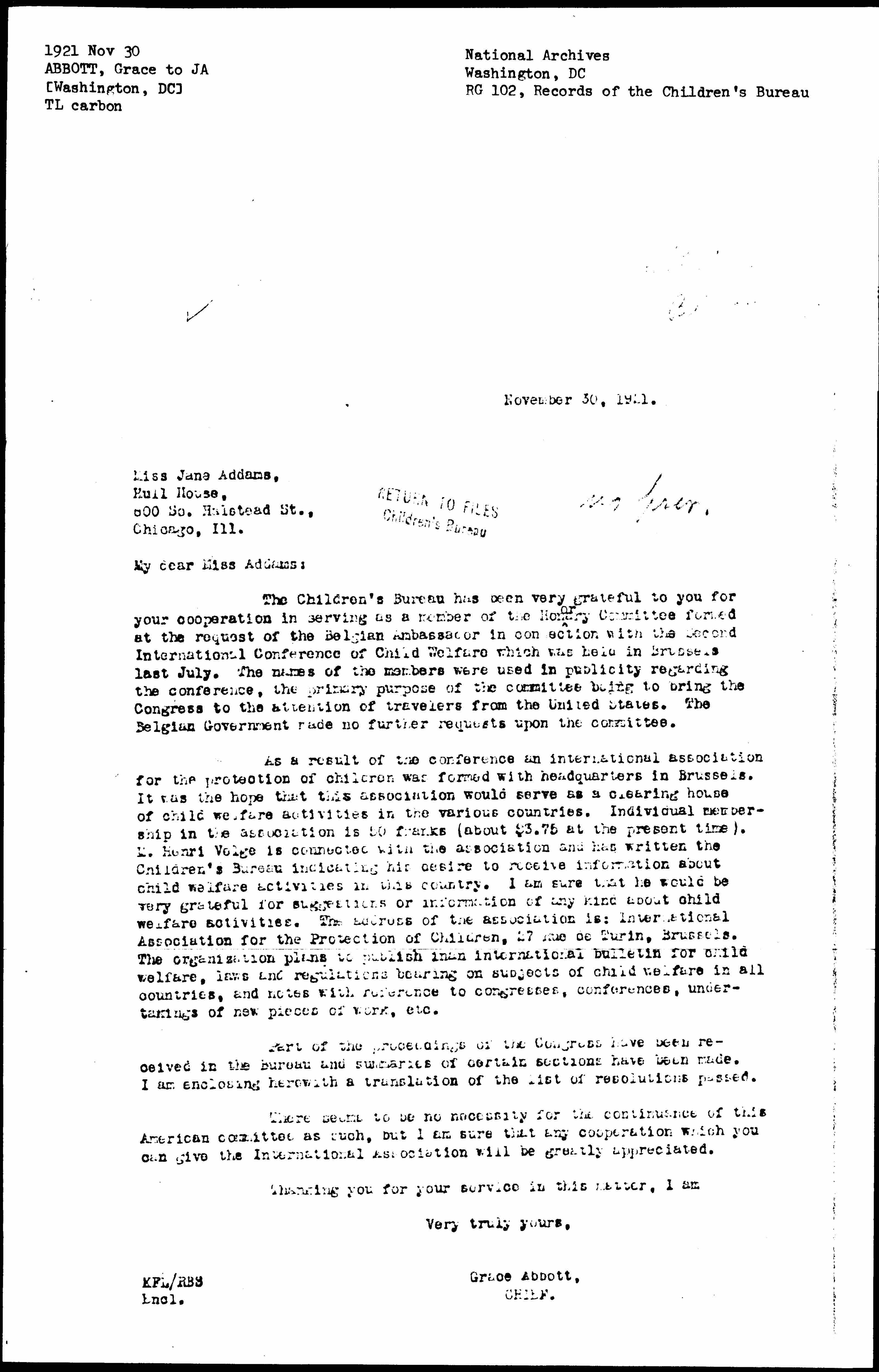 As a result of the conference an international association for the protection of children was formed with headquarters in Brussels. It was the hope that this association would serve as a clearing house of child welfare activities in the various countries. Individual membership in the association is 50 [francs] (about $3.75 at the present time). M. Henri [Velghe] is connected with the association and has written the Children's Bureau indicating his desire to receive information about child welfare activities in this country. I am sure that he would be very grateful for suggestions or information of any kind about child welfare activities. The address of the association is: International Association for the Protection of Children, 27 rue de Turin, Brussels. The organization plans to publish in an international bulletin for child welfare, laws and regulations bearing on subjects of child welfare in all countries, and notes with reference to congresses, conferences, undertakings of new pieces of work, etc.