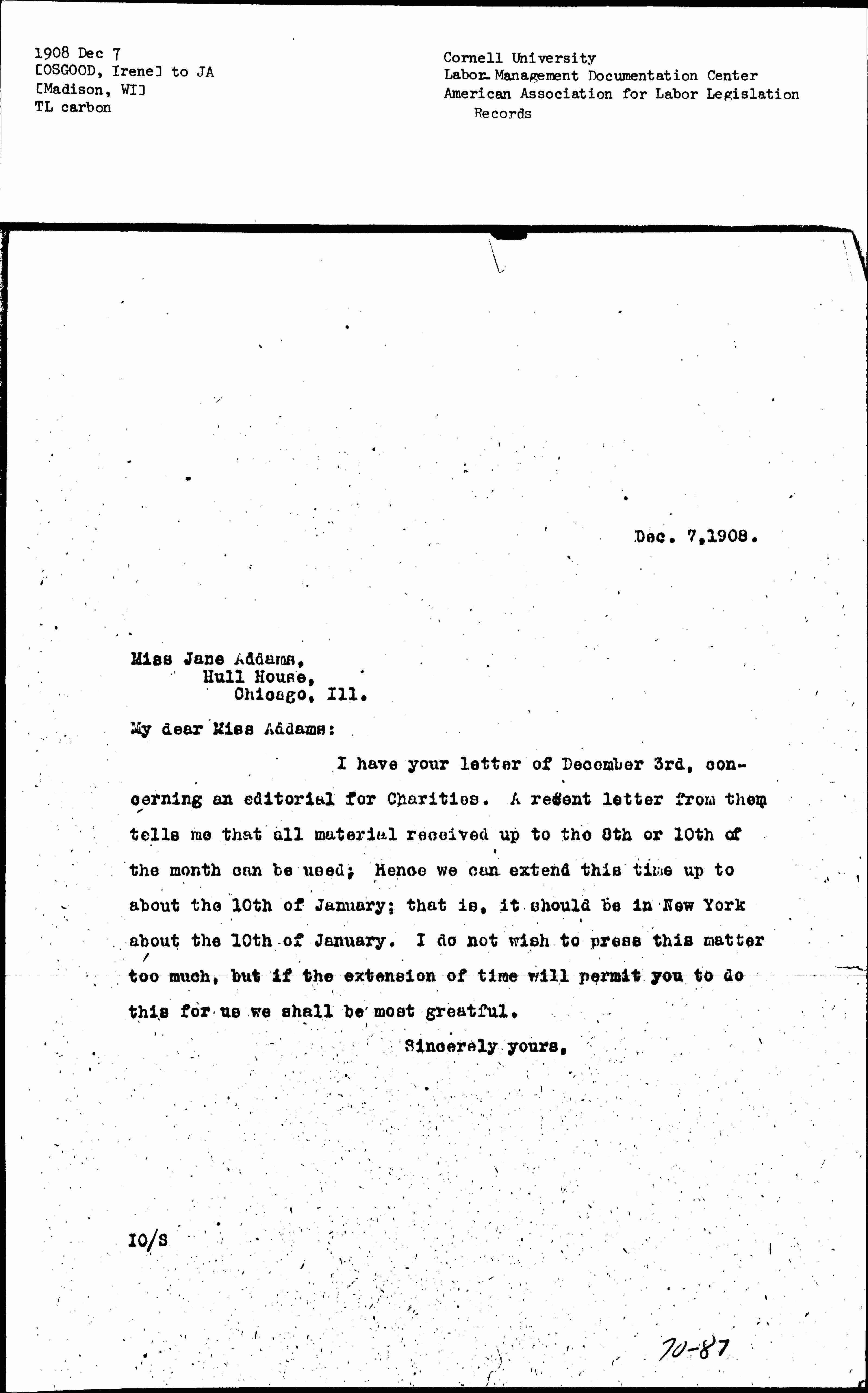I have your letter of December 3rd, concerning an editorial for Charities. A recent letter from them tells me that all material received up to the 8th or 10th of the month can be used; Hence we can extend this time up to about the 10th of January; that is, it should be in New York about the 10th of January. I do not wish to press this matter too much, but if the extension of time will permit you to do this for us we shall be most [grateful].