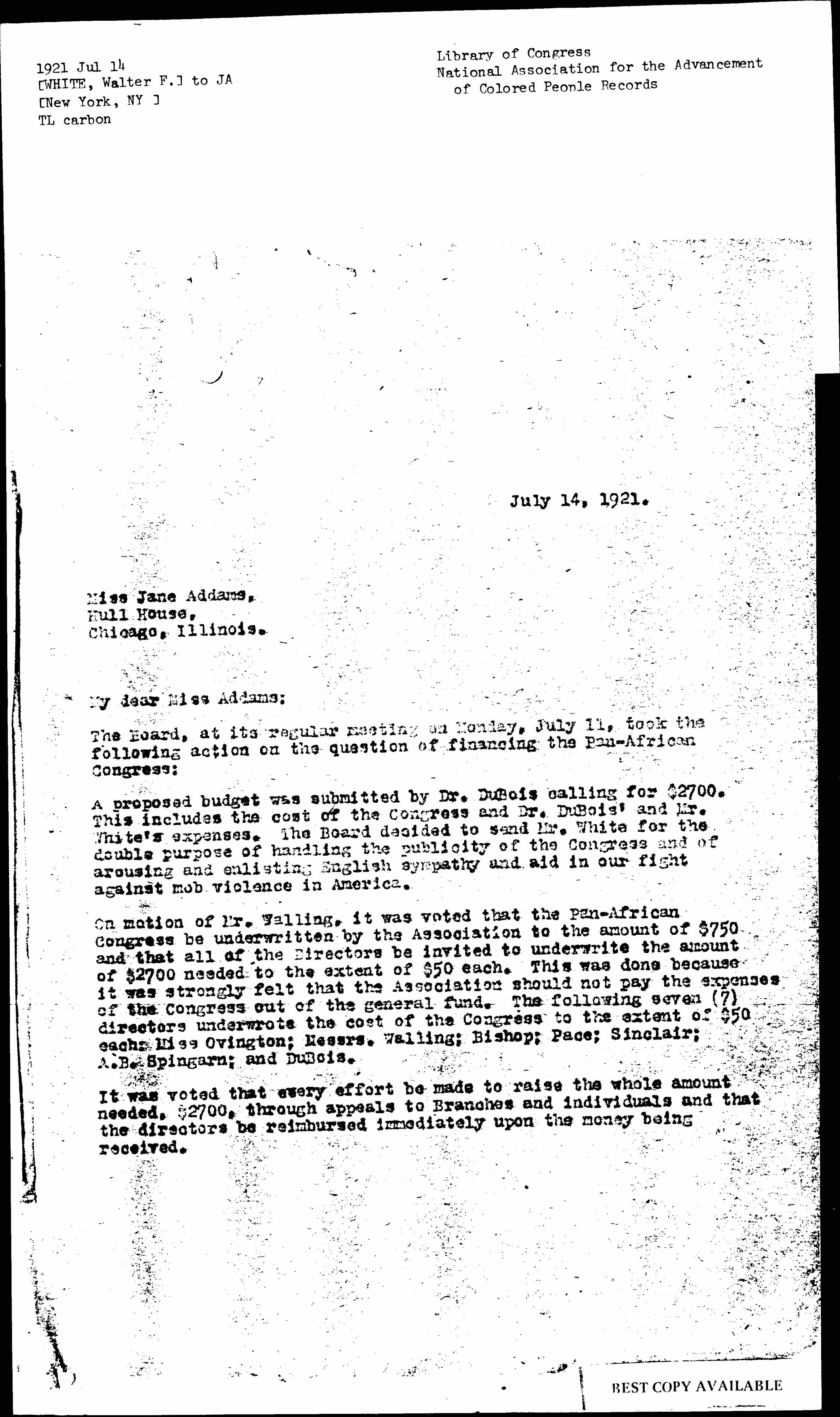 A proposed budget was submitted by Dr. [Du Bois] calling for $2700. This includes the cost of Congress and Dr. [Du Bois'] and Mr. White's expenses. The Board decided to send Mr. White for the double purpose of handling the publicity of the Congress and of arousing and enlisting English sympathy and aid in our fight against mob violence in America.