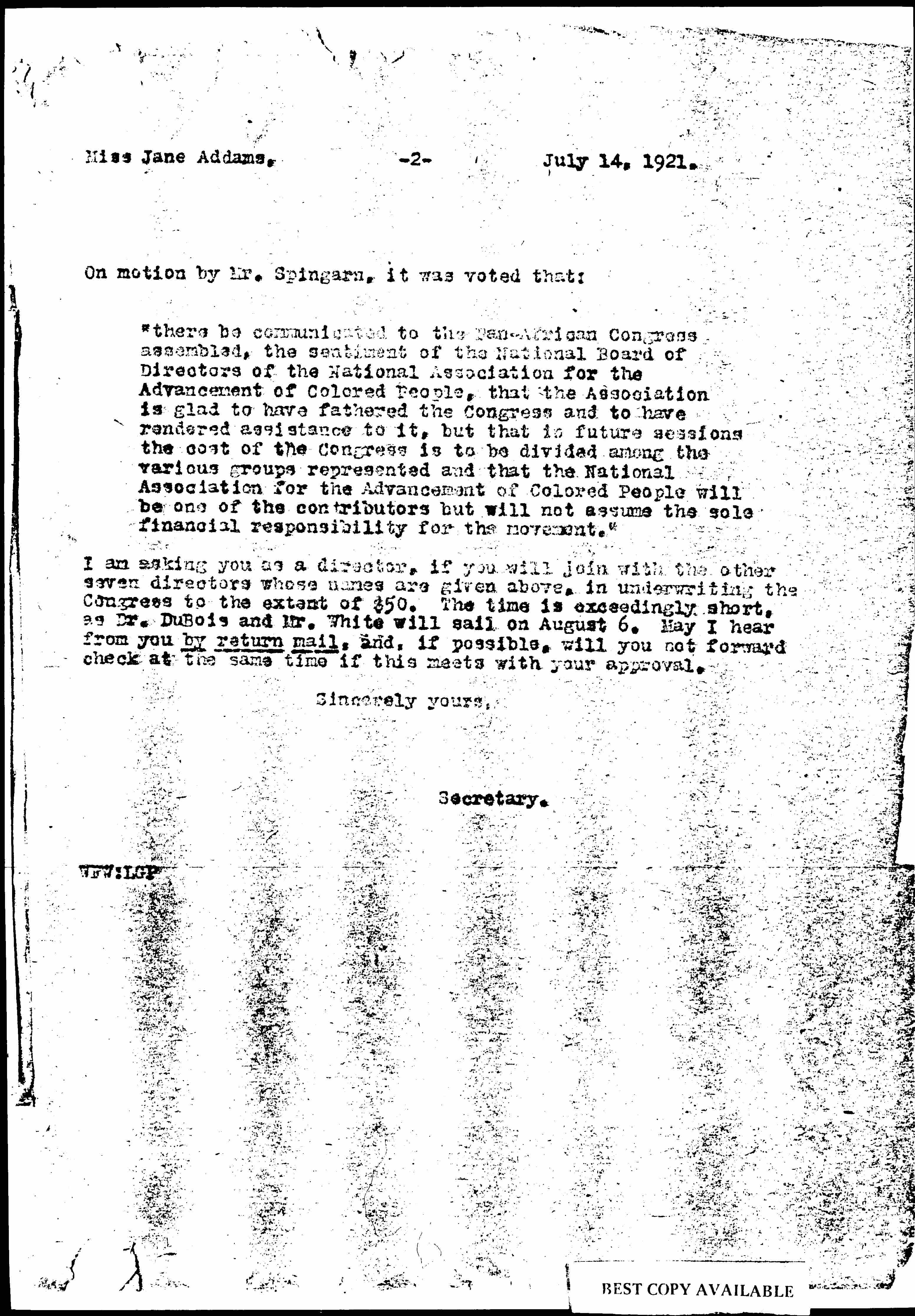 I am asking you as a director, if you will join with the other seven directors whose names are given above, in underwriting the Congress to the extent of $50. The time is exceedingly short, as Dr. [Du Bois] and Mr. White will sail on August 6. May I hear from you by return mail, and, if possible, will you not forward check at the same time if this meets with your approval.