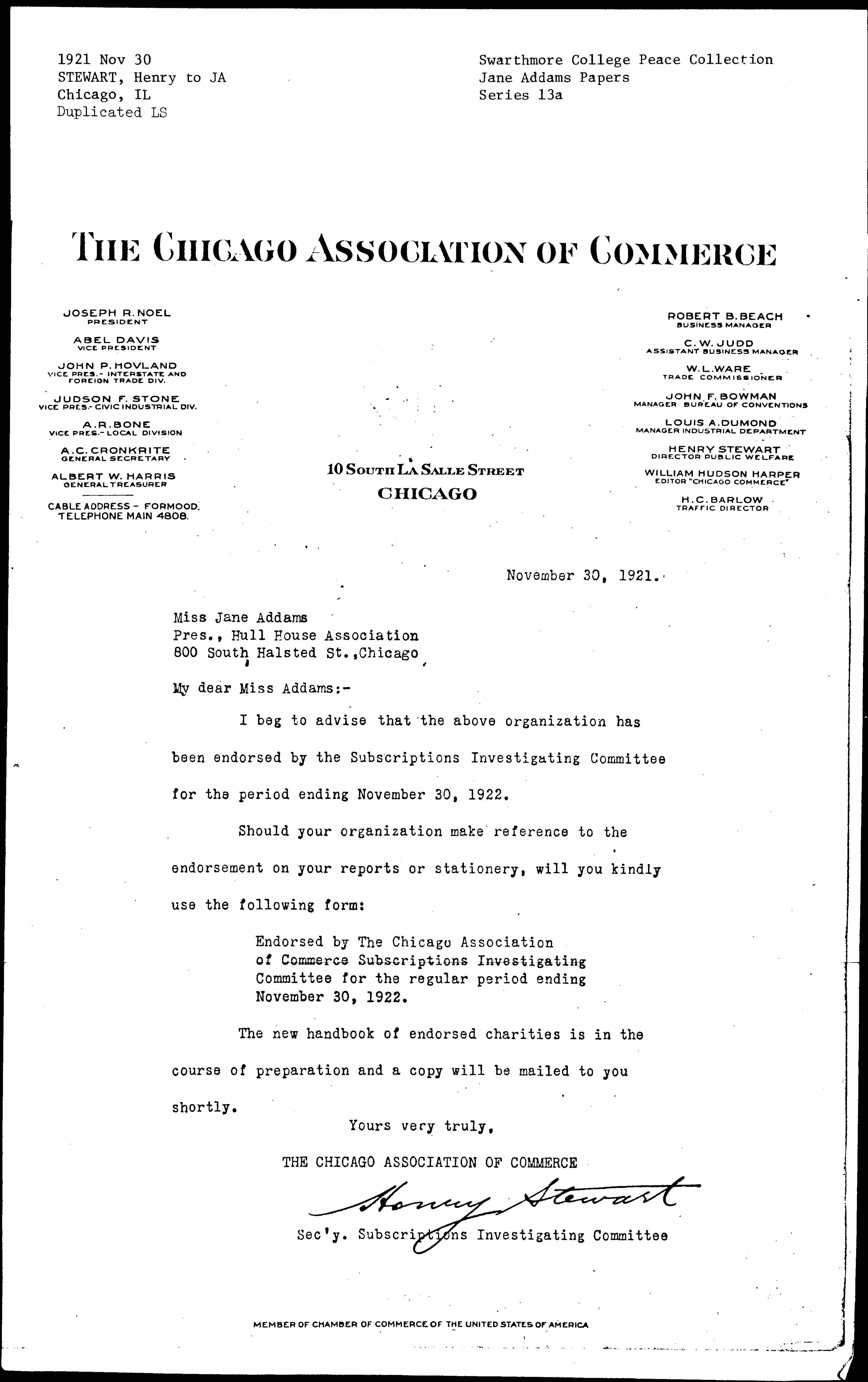 I beg to advise that the above organization has been endorsed by the Subscriptions Investigating Committee for the period ending November 30, 1922.