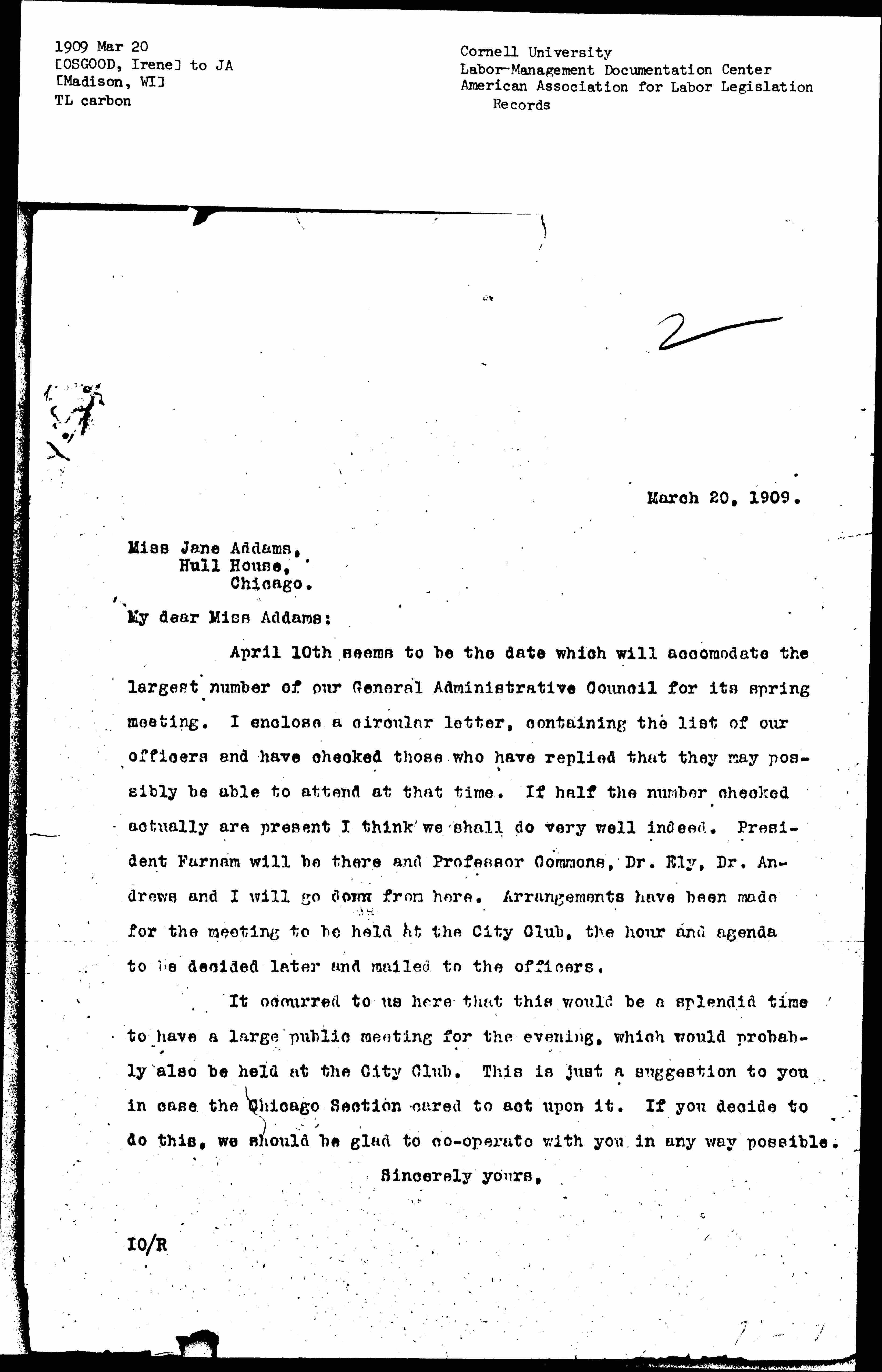 April 10th seems to be the date which will accommodate the largest number of our General Administrative Council for its spring meeting. I enclose a circular letter, containing the list of our officers and have checked those who have replied that they may possibly be able to attend at that time. If half the number checked actually are present I think we shall do very well indeed. President Farnam will be there and Professor Commons, Dr. Ely, Dr. Andrews and I will go down from here. Arrangements have been made for the meeting to be held at the City Club, the hour and agenda to be decided later and mailed to the officers.