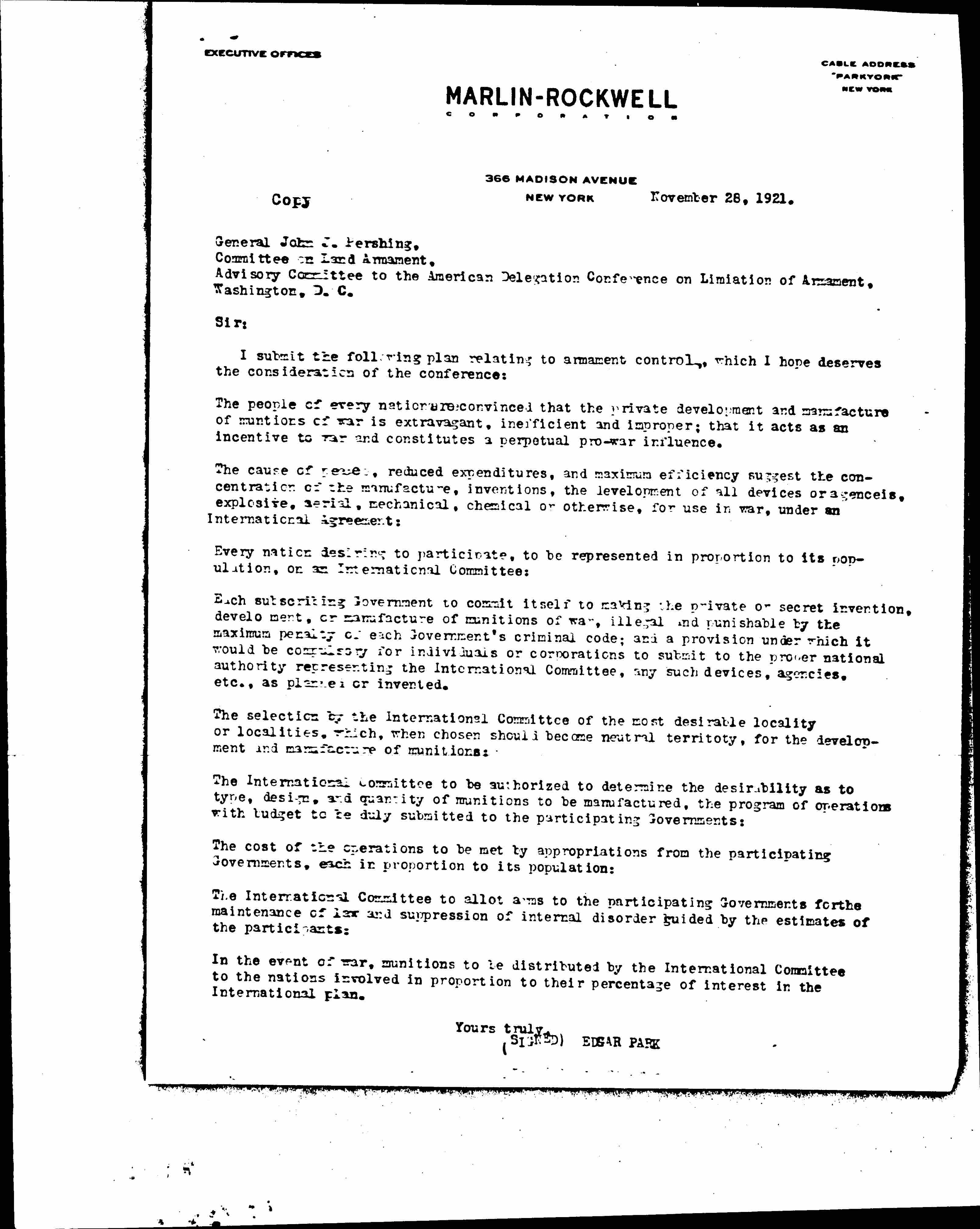 The cause of [peace?], reduced expenditures, and maximum efficiency suggest the concentration of the manufacture, inventions, and development of all devices or agencies, explosive, aerial, mechanical, chemical or otherwise, for use in war, under an International Agreement:
