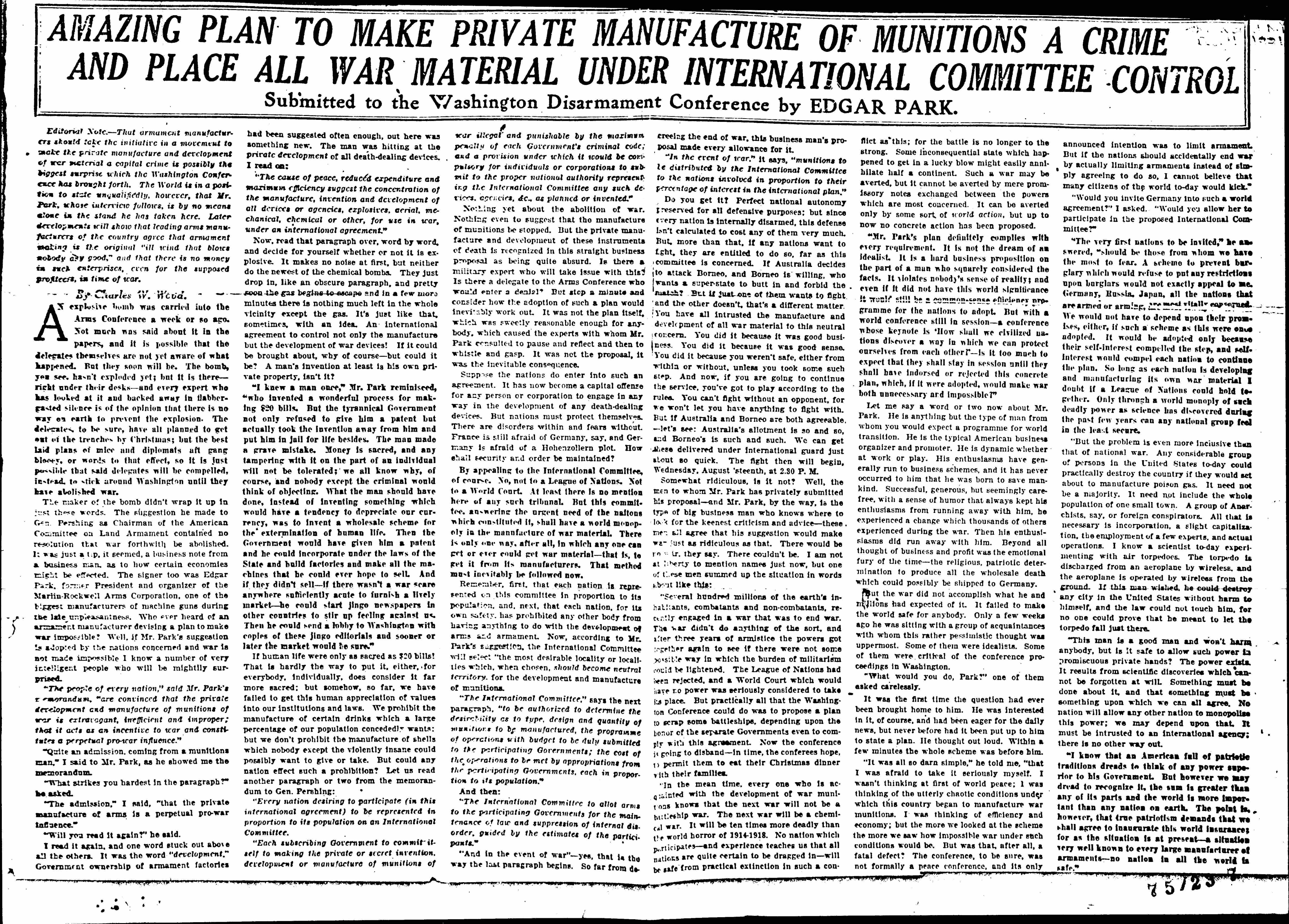 Editorial Note. -- That armament manufacturers should take the initiative in in a movement to make the private manufacture and development of war material a capital crime is possibly the biggest surprise which the Washington Conference has brought forth. The World is in a position to state unqualifiedly, however, that Mr. Park, whose interview follows, is by no means alone in the stand he has taken here. Later developments will show that leading arms manufacturers of the country agree that armament making is the original "ill will that blows nobody any good," and that there is no money in such enterprises, even for the supposed profiteers, in time of war.By Charles W. Wood.