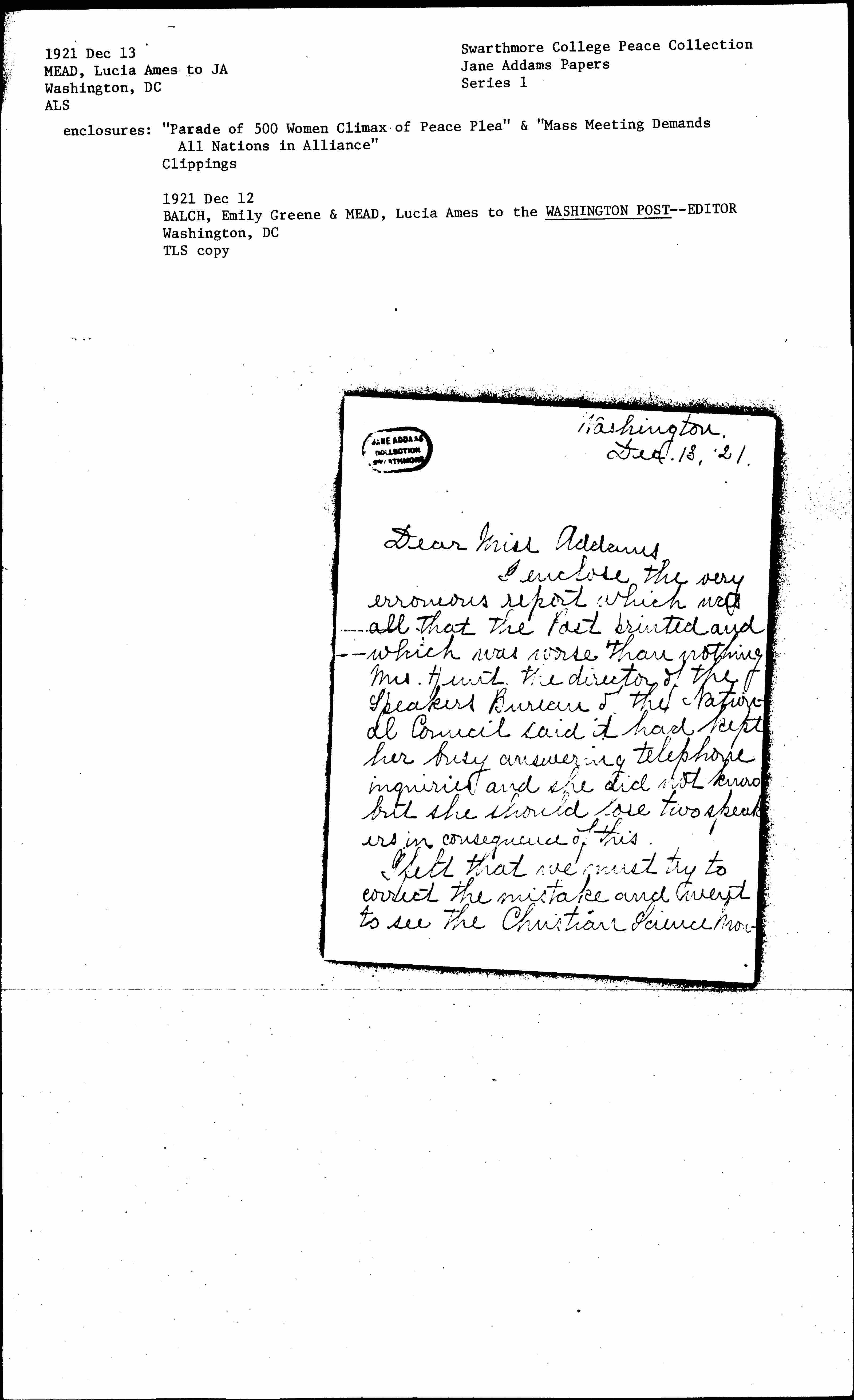 I felt that we must try to correct the mistake and went to see the Christian Science Monitor [page 2] and be sure that Boston got a correct report, and then I went over to the Grace Dodge and took a letter which Miss Balch and I wrote to the Post. I enclose a copy. It did not appear this morning.