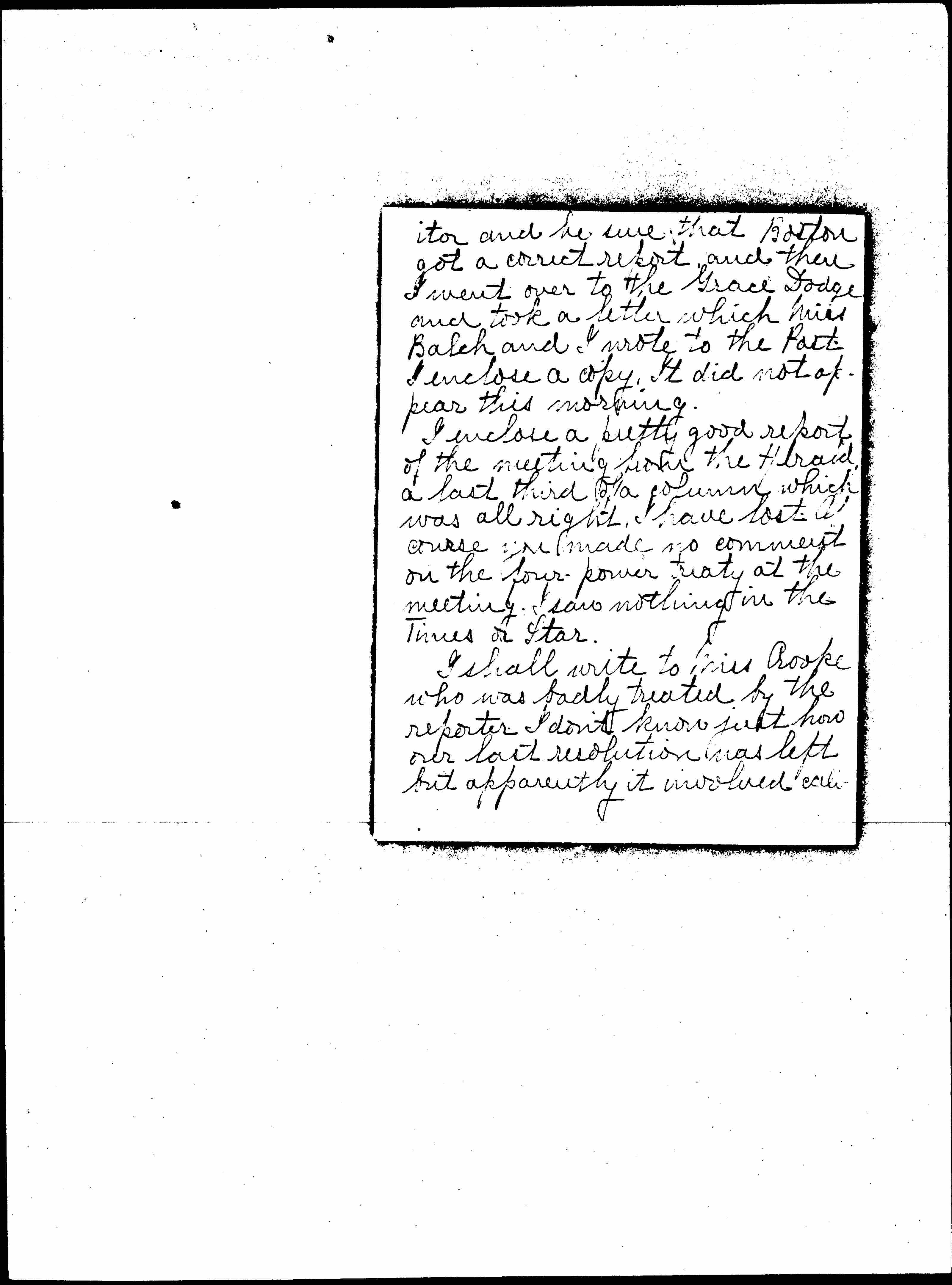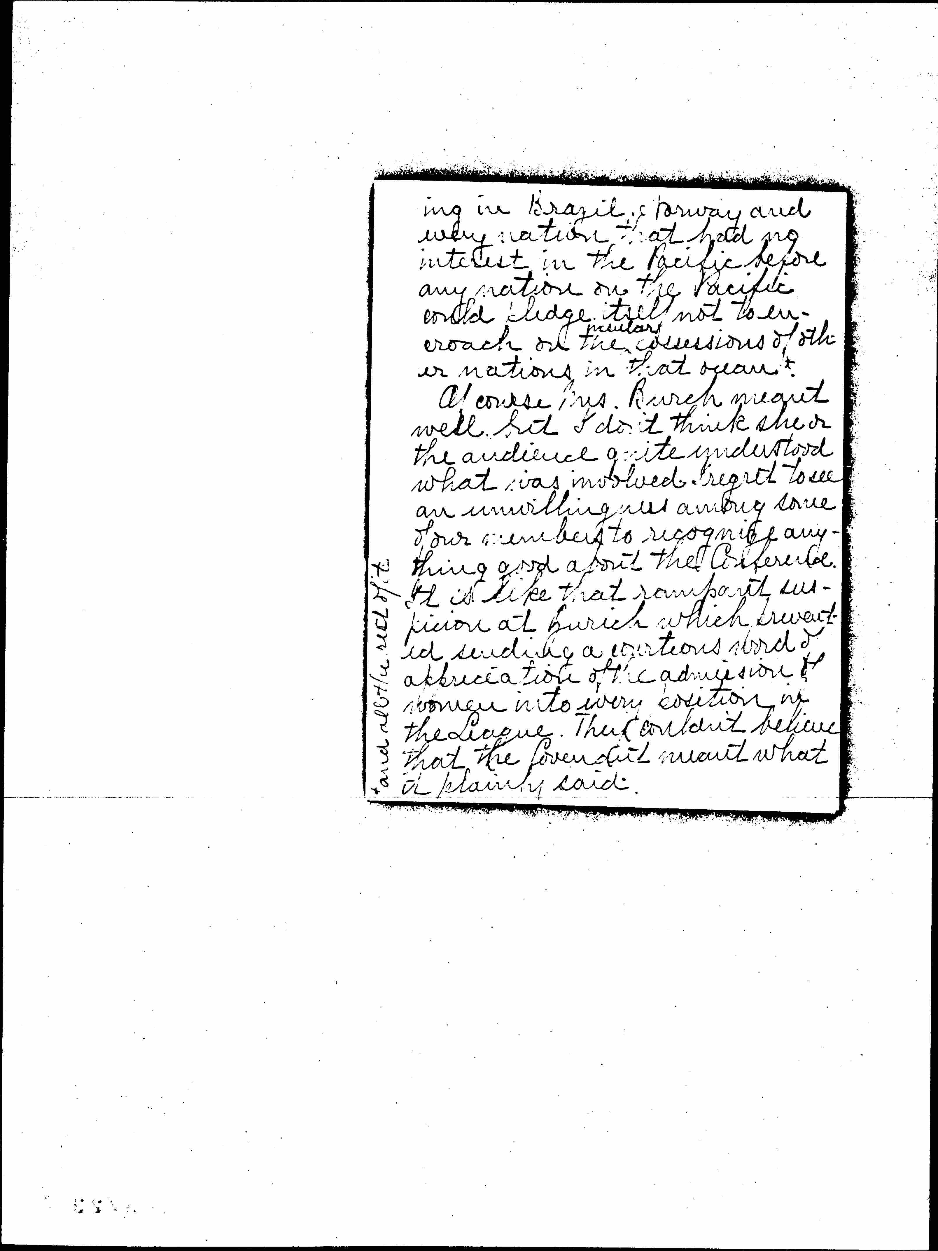 I shall write to Miss [Crook] who was badly treated by the reporter. I don't know just how our last resolution was left but apparently it involved calling [page 3] in Brazil & Norway and every nation that had no interest in the Pacific before any nation on the Pacific could pledge itself not to encroach on the ↑[insular?]↓ [possessions?] of other nations in that ocean.*