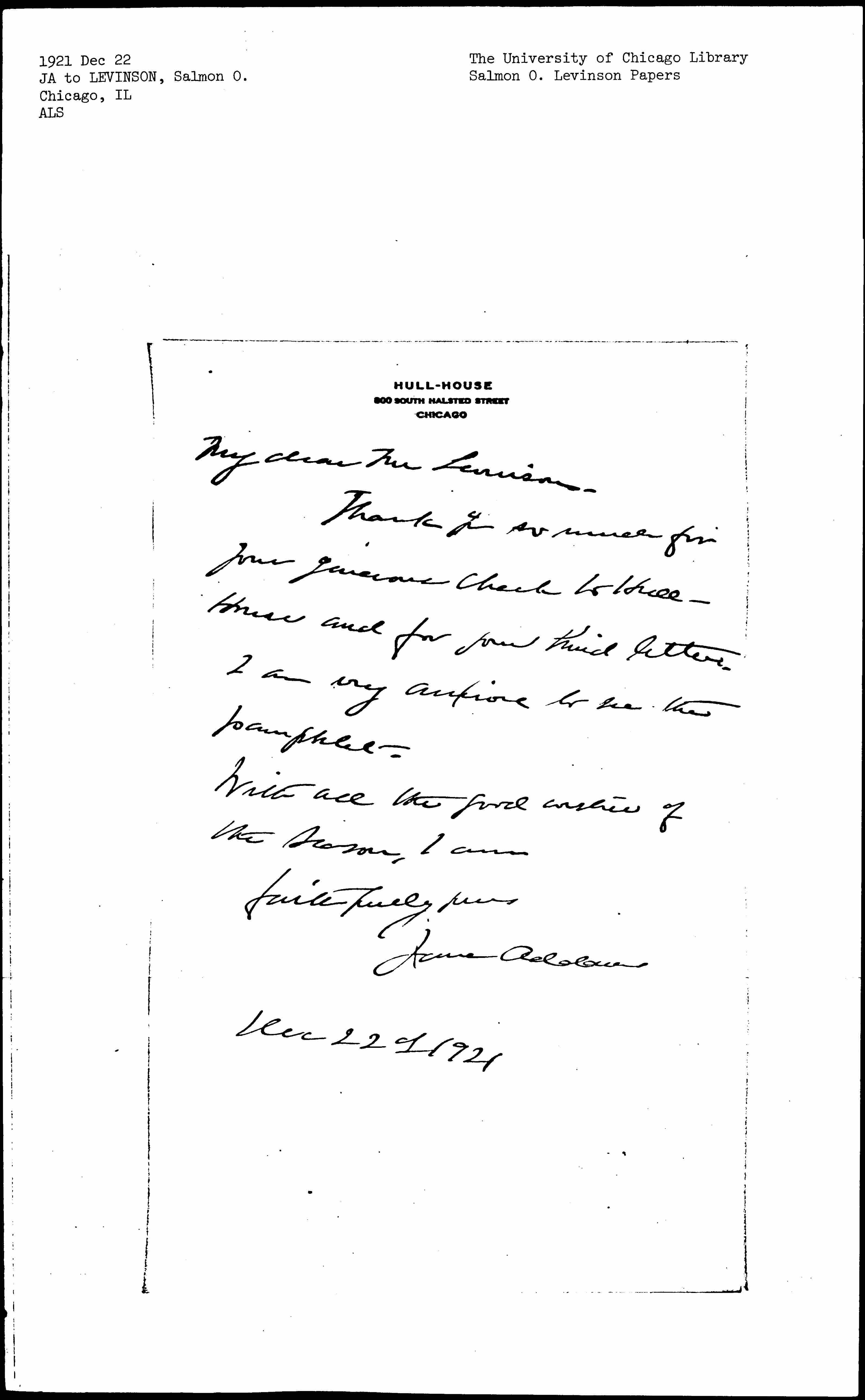 Thank you so much for your generous check to Hull-House and for your kind letter. I am very anxious to see the pamphlet.