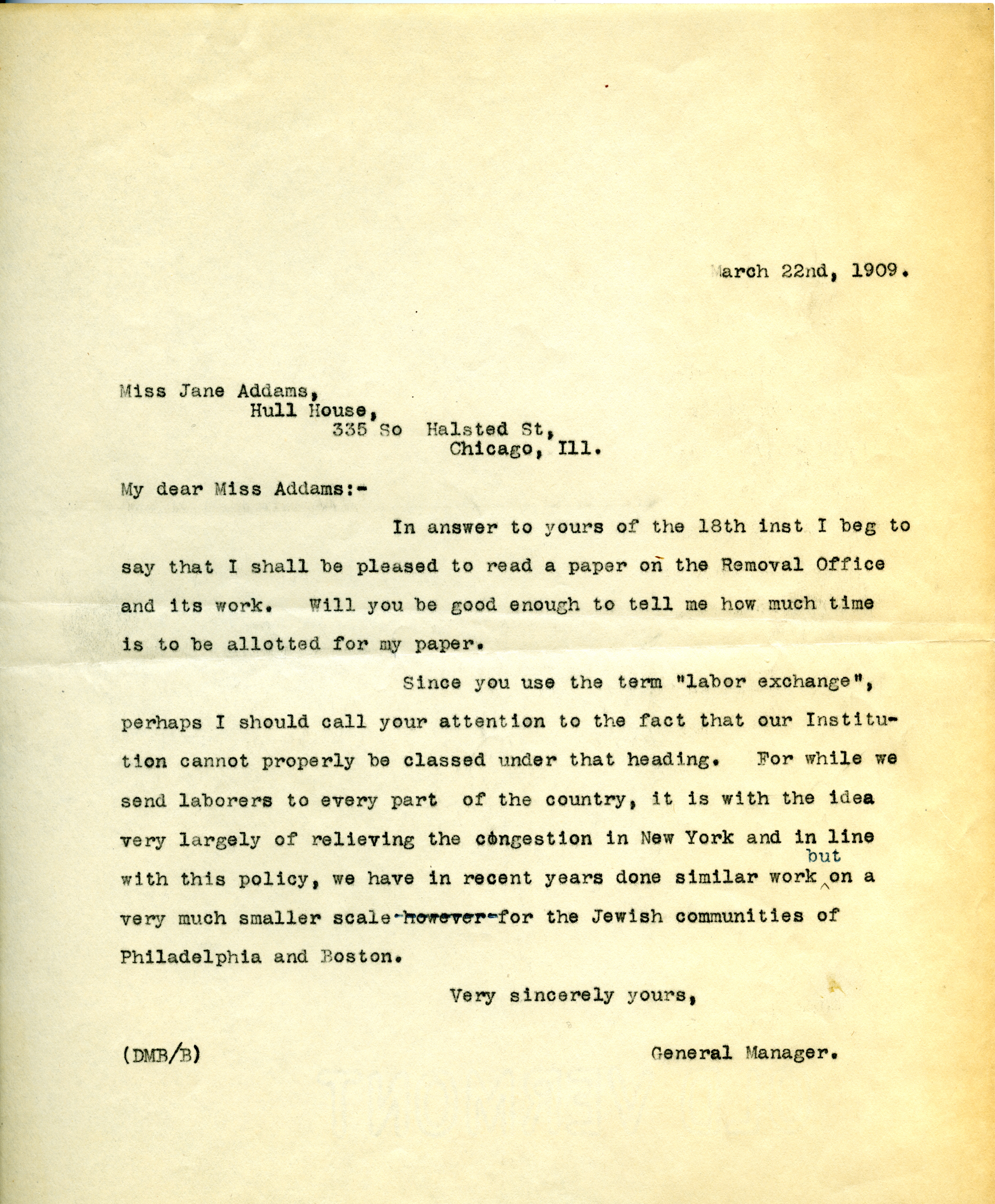 Since you use the term "labor exchange", perhaps I should call your attention to the fact that our Institution cannot properly be classed under that heading. For while we send laborers to every part of the country, it is with the idea very largely of relieving the congestion in New York and in line with this policy, we have in recent years done similar work ↑but↓ on a very much smaller scale however for the Jewish communities of Philadelphia and Boston.