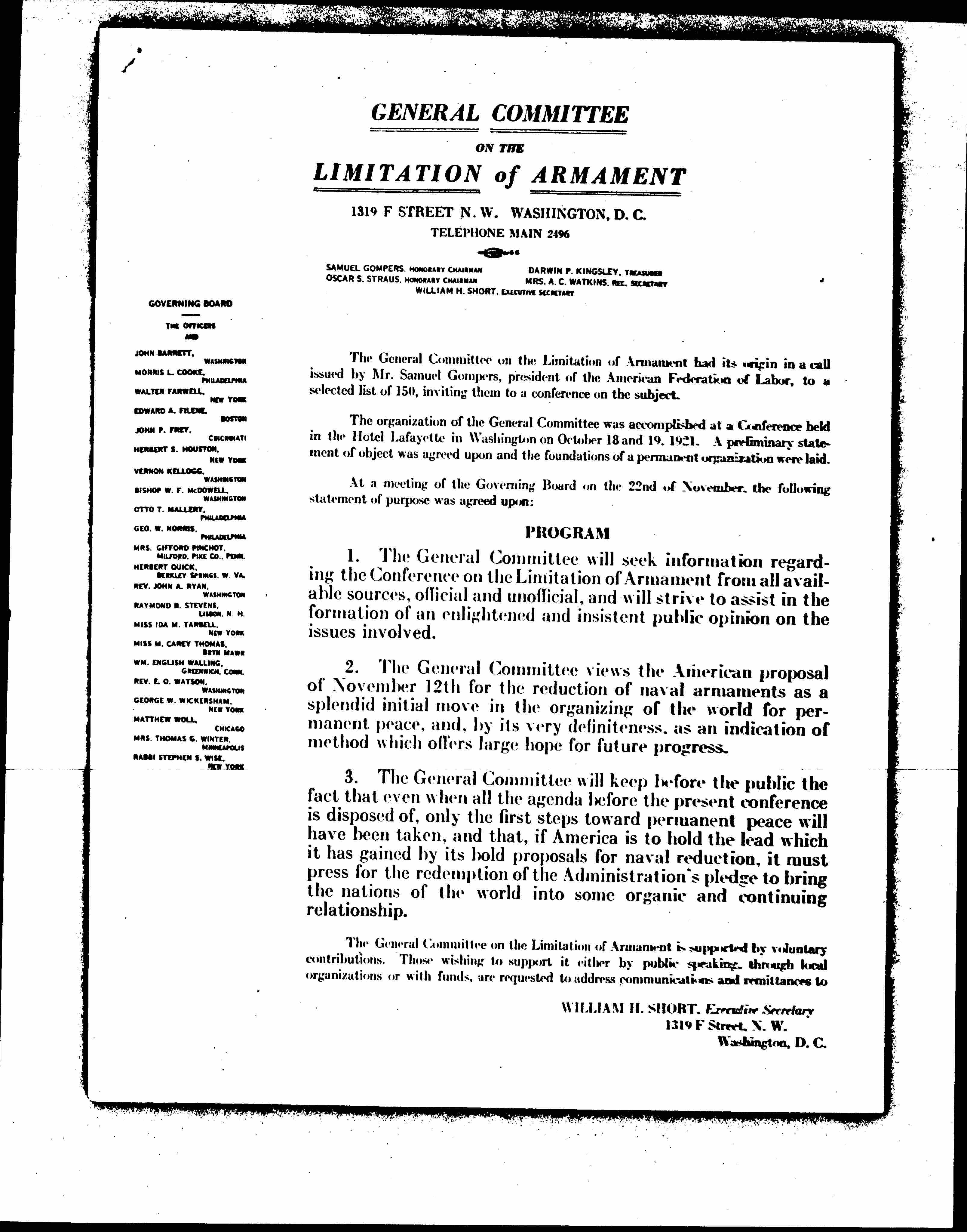 The General Committee on the Limitation of Armament had its origin in a call issued by Mr. Samuel Gompers, president of the American Federation of Labor, to a selected list of 150, inviting them to a conference on the subject.