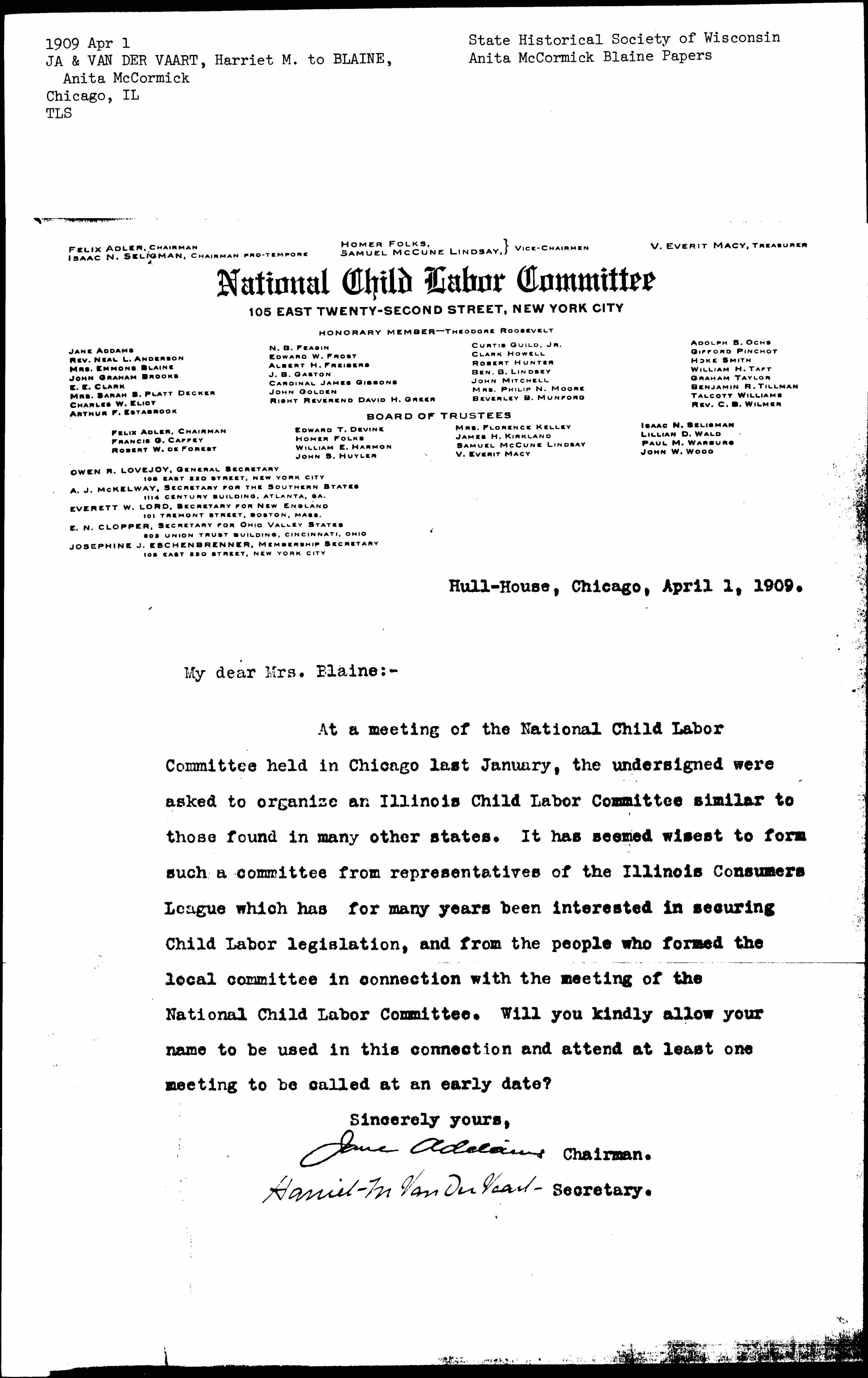 At a meeting of the National Child Labor Committee held in Chicago last January, the undersigned were asked to organize an Illinois Child Labor Committee similar to those found in many other states. It has seemed wisest to form such a committee from representatives of the Illinois Consumers League which has for many years been interested in securing Child Labor legislation, and from the people who formed the local committee in connection with the meeting of the National Child Labor Committee. Will you kindly allow your name to be used in this connection and attend at least one meeting to be called at an early date?