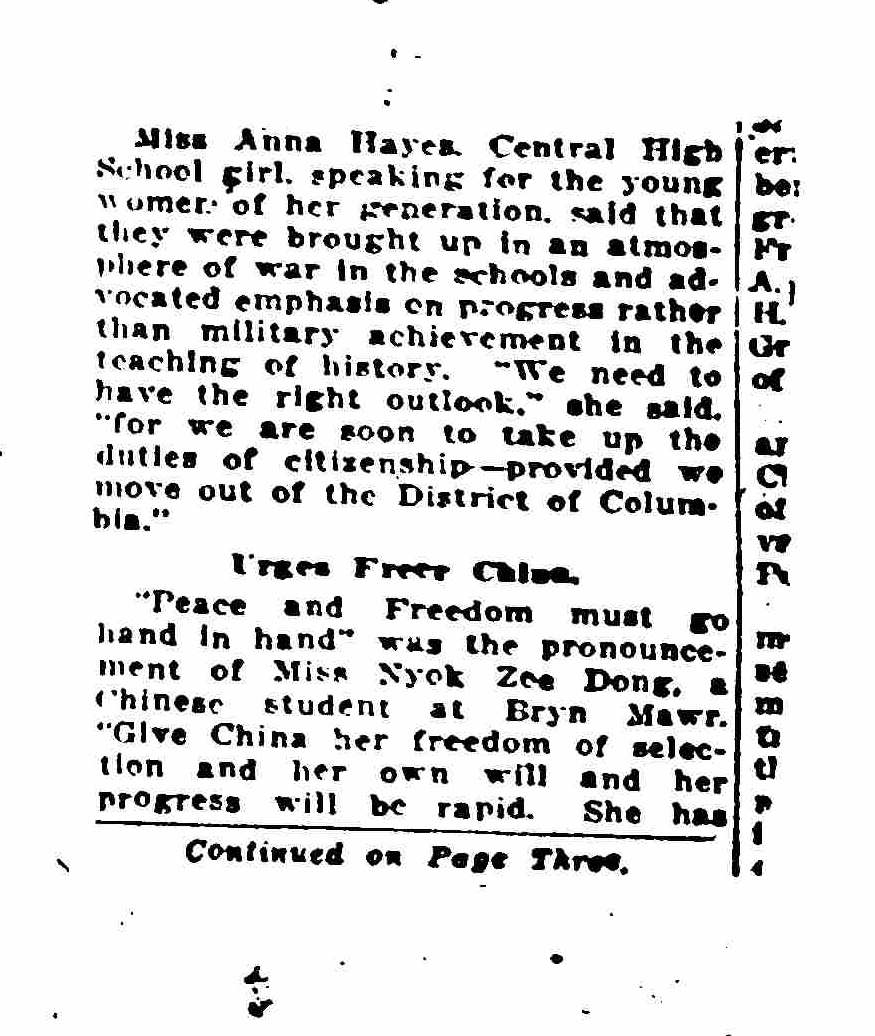 The meeting was held under the auspices of the Women's International League for Peace and Freedom, with Miss Jane Addams, of Chicago, presiding, and it was addressed by speakers from many countries, including Nyok Zoe Dong, a Chinese student and Miss Garja Barish, a Russian refugee. Mme. Inouye of Japan who came to this country bearing a petition from Japanese women was also one of the speakers.