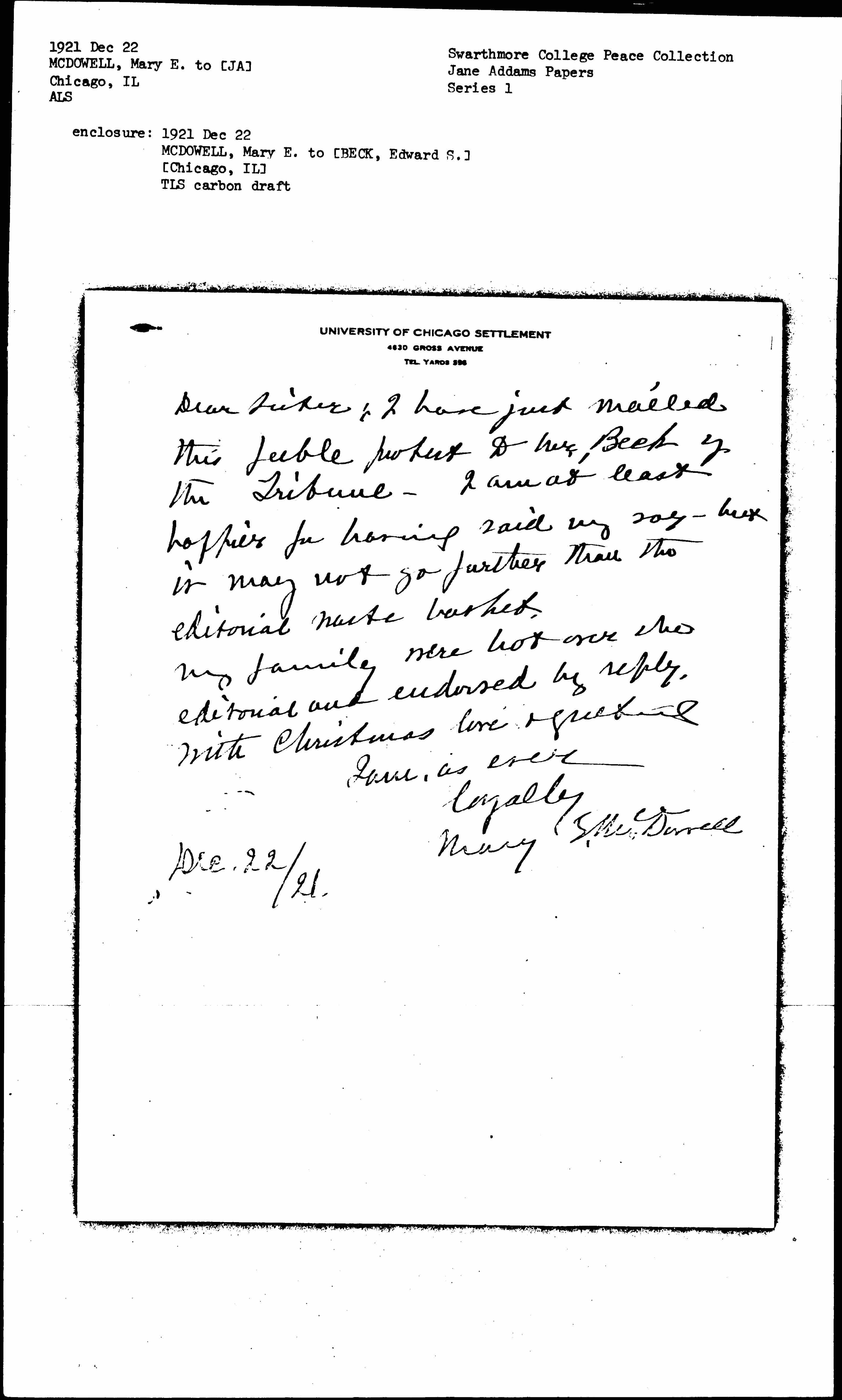 Dear Sister: I have just mailed this feeble protest to Mr. Beck of the Tribune. I am at least happier for having said my say -- but it may not go further than the editorial waste basket.