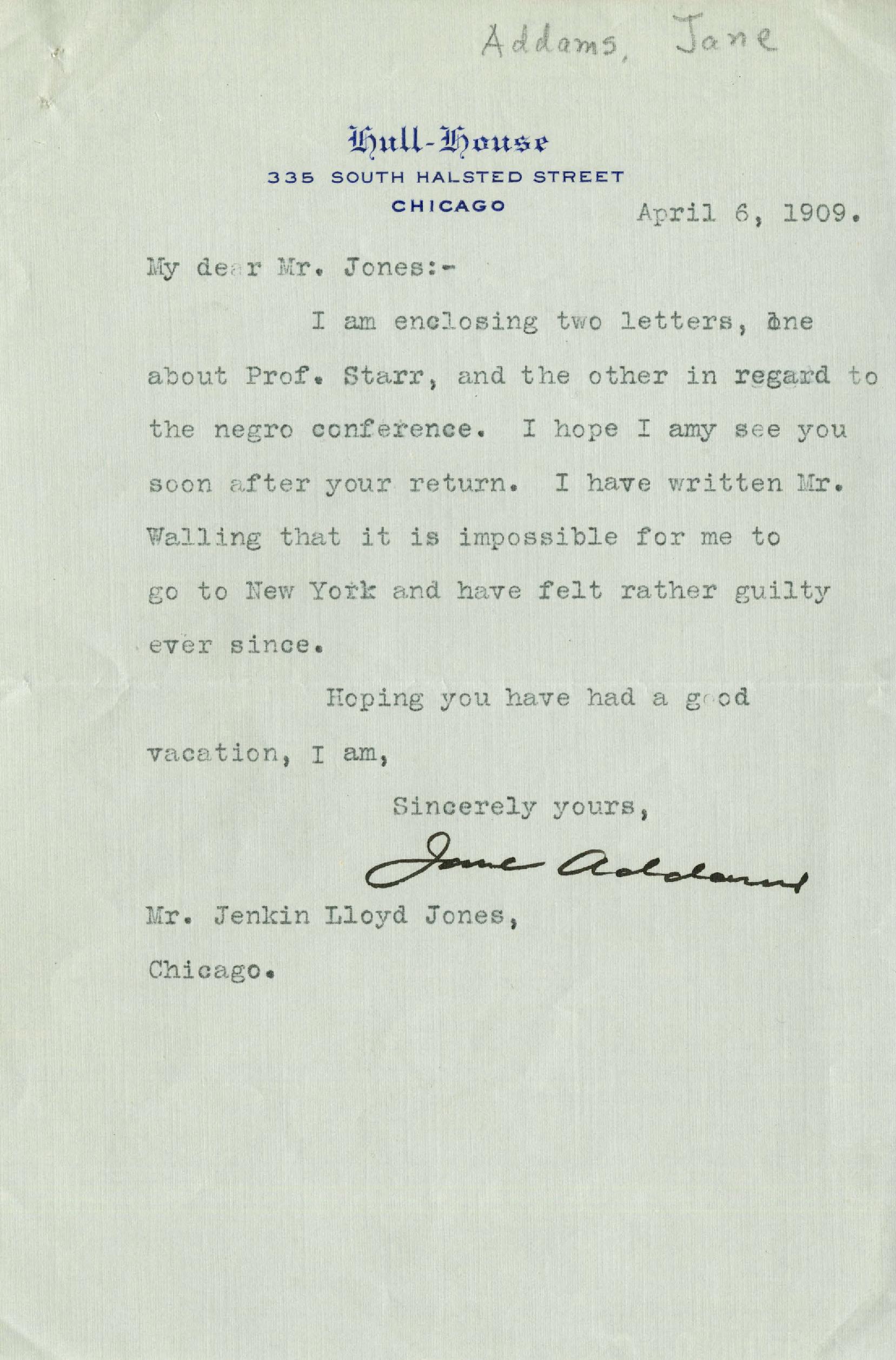I am enclosing two letters, one about Prof. Starr, and the other in regard to the negro conference. I hope I may see you soon after your return. I have written Mr. Walling that it is impossible for me to go to New York and have felt rather guilty ever since.