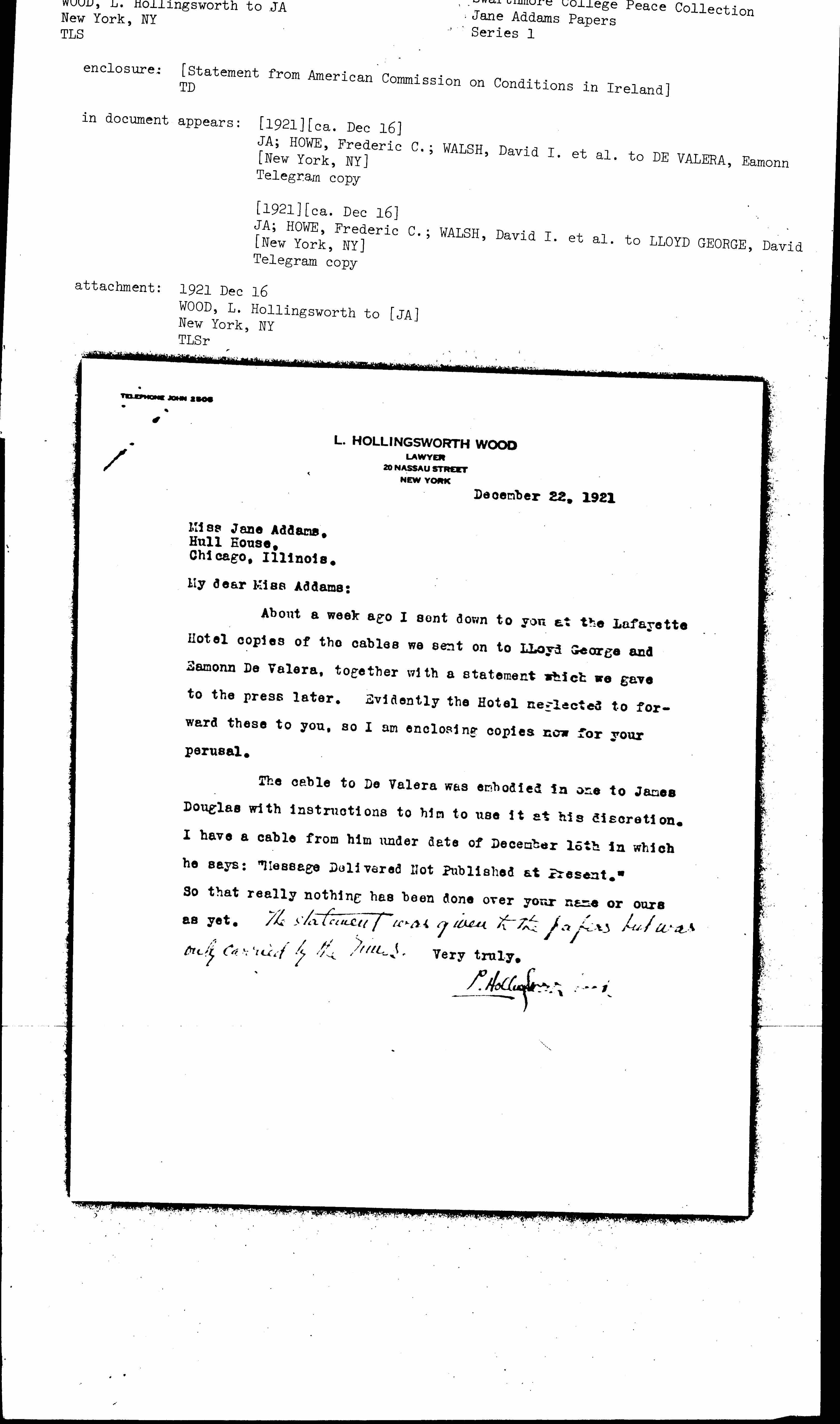 About a week ago I sent down to you at the Lafayette Hotel copies of the cables we sent on to Lloyd George and [Éamonn] De Valera, together with a statement which we gave to the press later. Evidently the Hotel neglected to forward these to you, so I am enclosing copies now for your perusal.