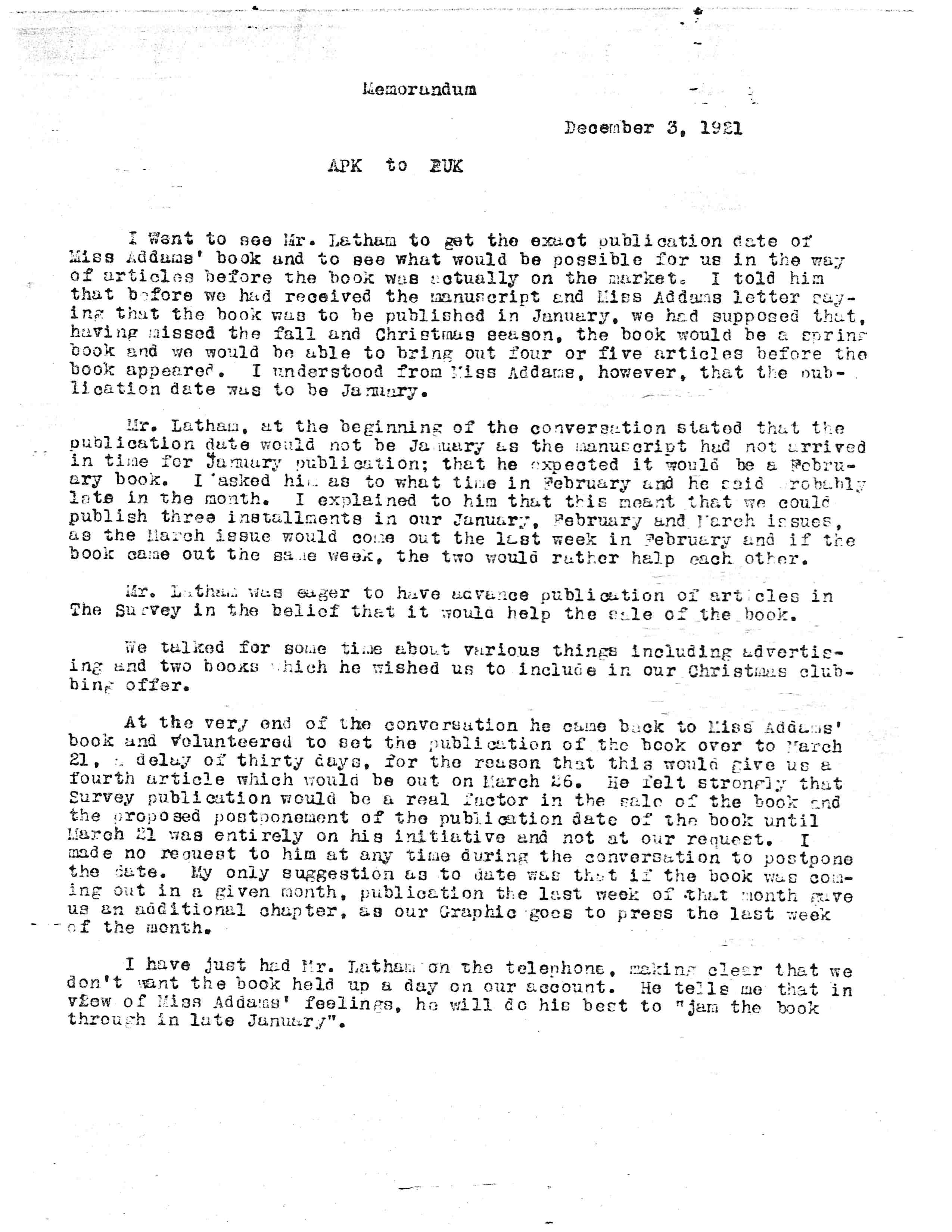 I went to see Mr. Latham to get the exact publication date of Miss Addams' book and to see what would be possible for us in the way of articles before the book was actually on the market. I told him that before we had received the manuscript and Miss Addams letter saying that the book was to be published in January, we had supposed that, having missed the fall and Christmas season, the book would be a spring book and we would be able to bring out four or five articles before the book appeared. I understood from Miss Addams, however, that the publication date was to be January.