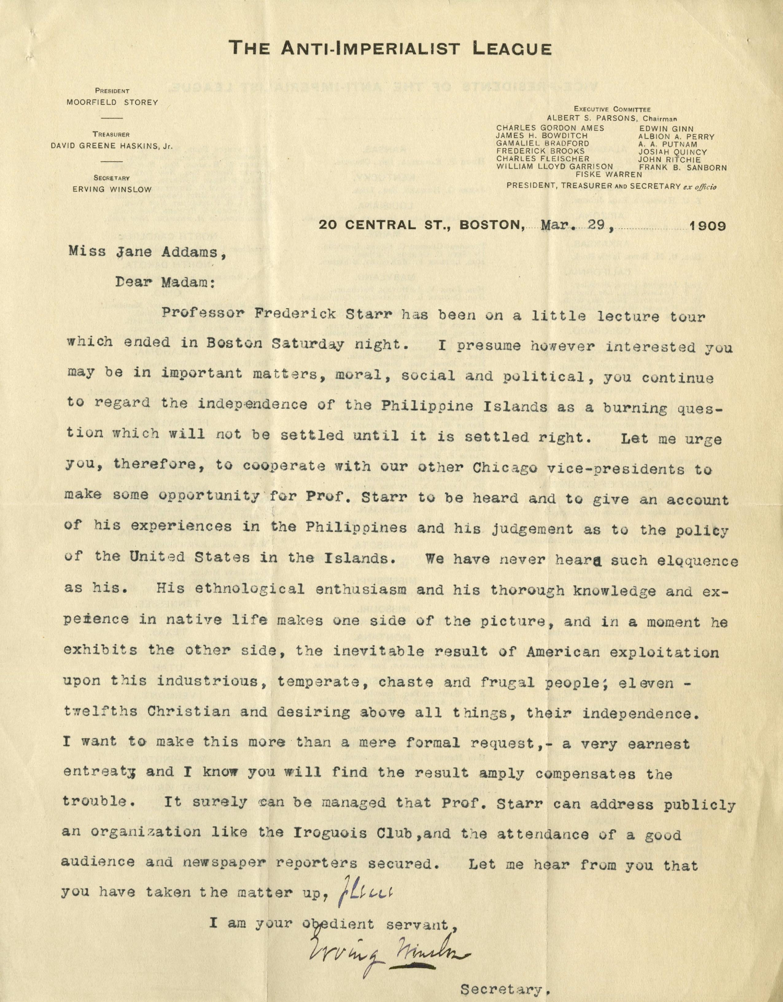 Professor Frederick Starr has been on a little lecture tour which ended in Boston Saturday night. I presume however interested you may be in important matters, moral, social and political, you continue to regard the independence of the Philippine Islands as a burning question which will not be settled until it is settled right. Let me urge you, therefore, to cooperate with our other Chicago vice-presidents make some opportunity for Prof. Starr to be heard and to give an account of his experiences in the Philippines and his judgement as to the polity of the United States in the Islands. We have never heard such eloquence as his. His ethnological enthusiasm and his thorough knowledge and experience in native life makes one side of the picture, and in a moment he exhibits the other side, the inevitable result of American exploitation upon this industrious, temperate, chaste and frugal people; eleven-twelfths Christian and desiring above all things, their independence. I want to make this more than a mere formal request, -- a very earnest entreaty and I know you will find the result amply compensates the trouble. It surely can be managed that Prof. Starr can address publicly an organization like the Iroquois Club, and the attendance of a good audience and newspaper reporters secured. Let me hear from you that you have taken the matter up, ↑please↓