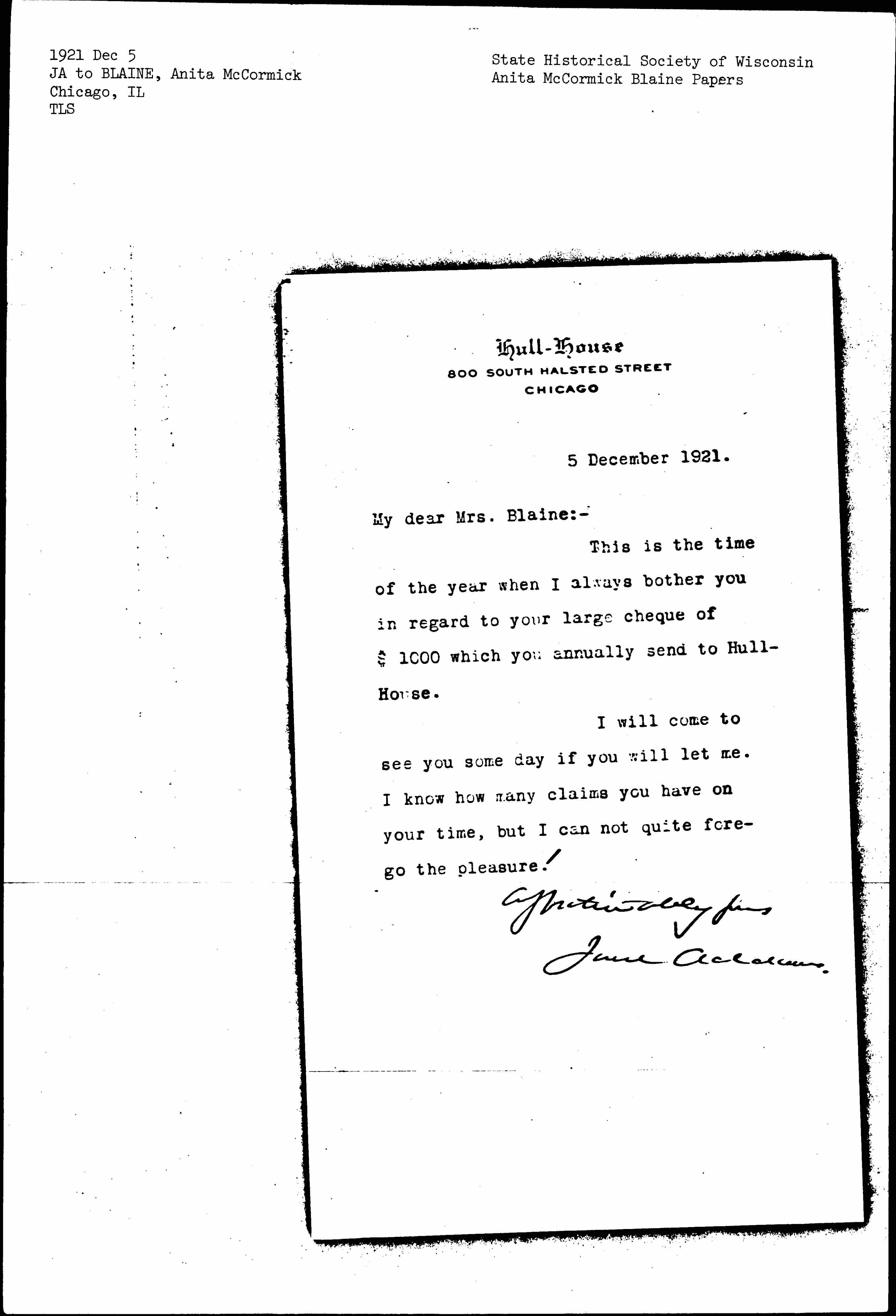 This is the time of the year when I always bother you in regard to your large [check] of $1000 which you annually send to Hull-House.