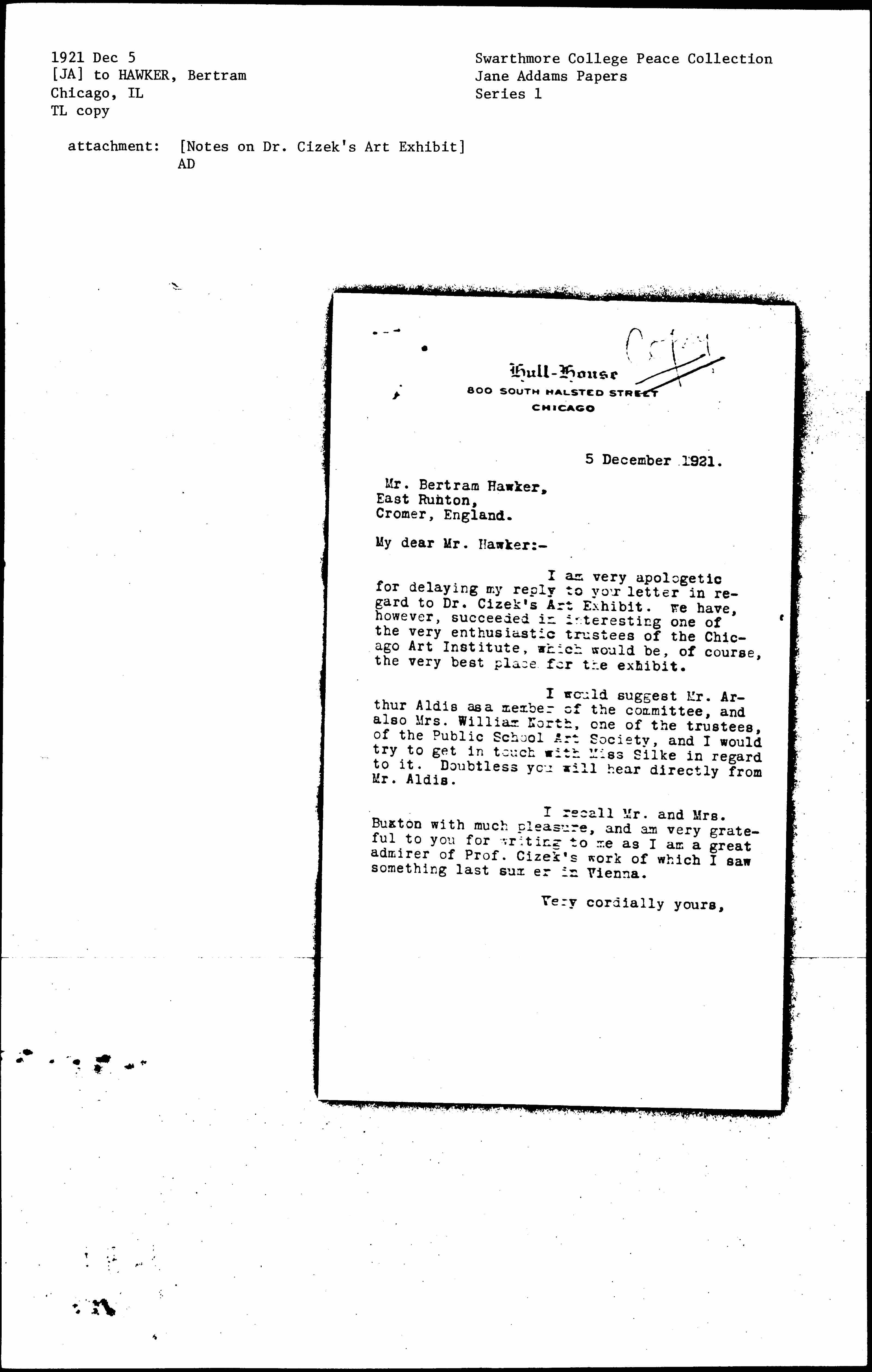 I am very apologetic for delaying my reply to your letter in regard to Dr. Cižek's Art Exhibit. We have, however, succeeded in interesting one of the very enthusiastic trustees of the Chicago Art Institute, which would be, of course, the very best place for the exhibit.