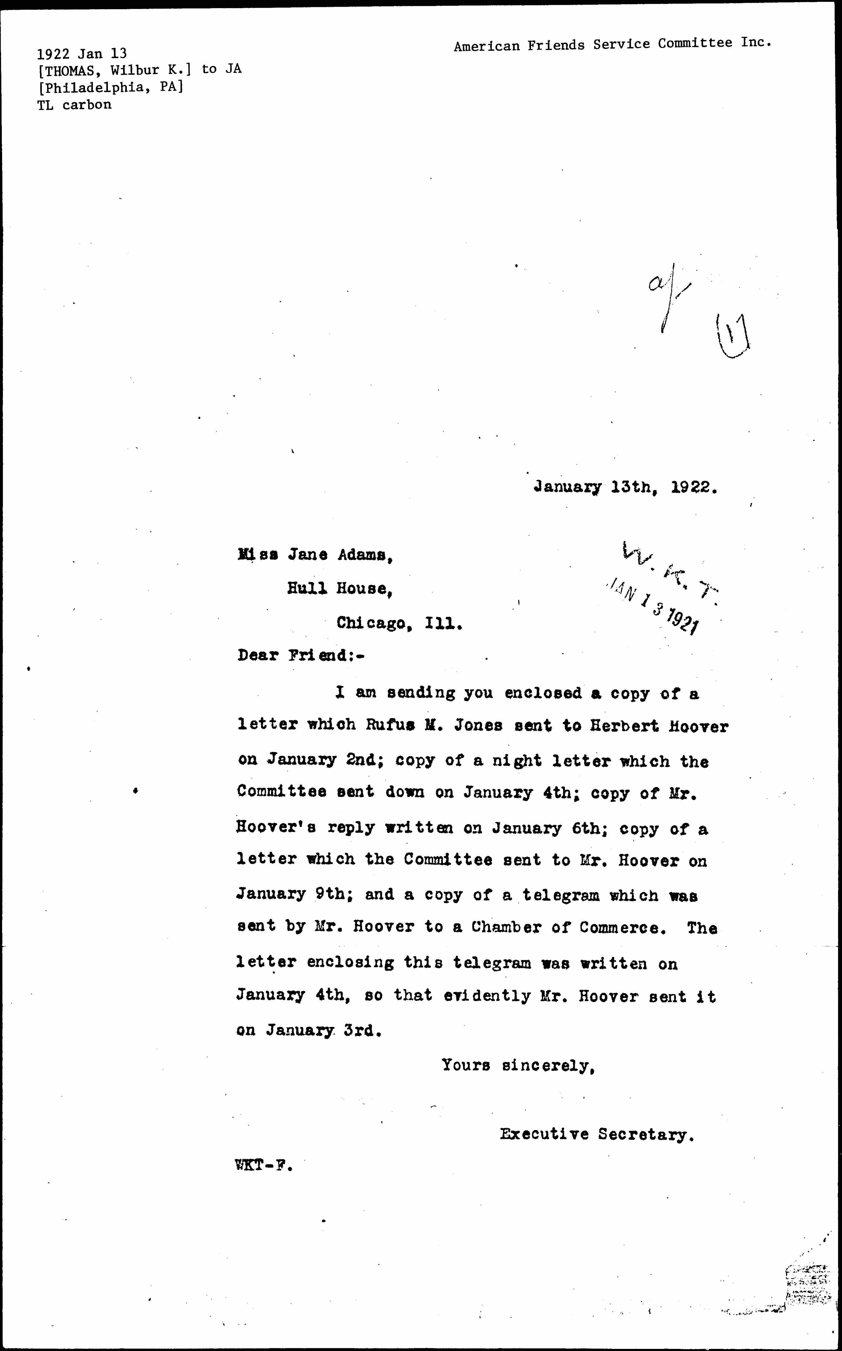 I am sending you enclosed a copy of a letter which Rufus M. Jones sent to Herbert Hoover on January 2nd; copy of a night letter which the Committee sent down on January 4th; copy of Mr. Hoover's reply written on January 6th; copy of a letter which the Committee sent to Mr. Hoover on January 9th; and a copy of a telegram which was sent by Mr. Hoover to a Chamber of Commerce. The letter enclosing this telegram was written on January 4th, so that evidently Mr. Hoover sent it on January 3rd.