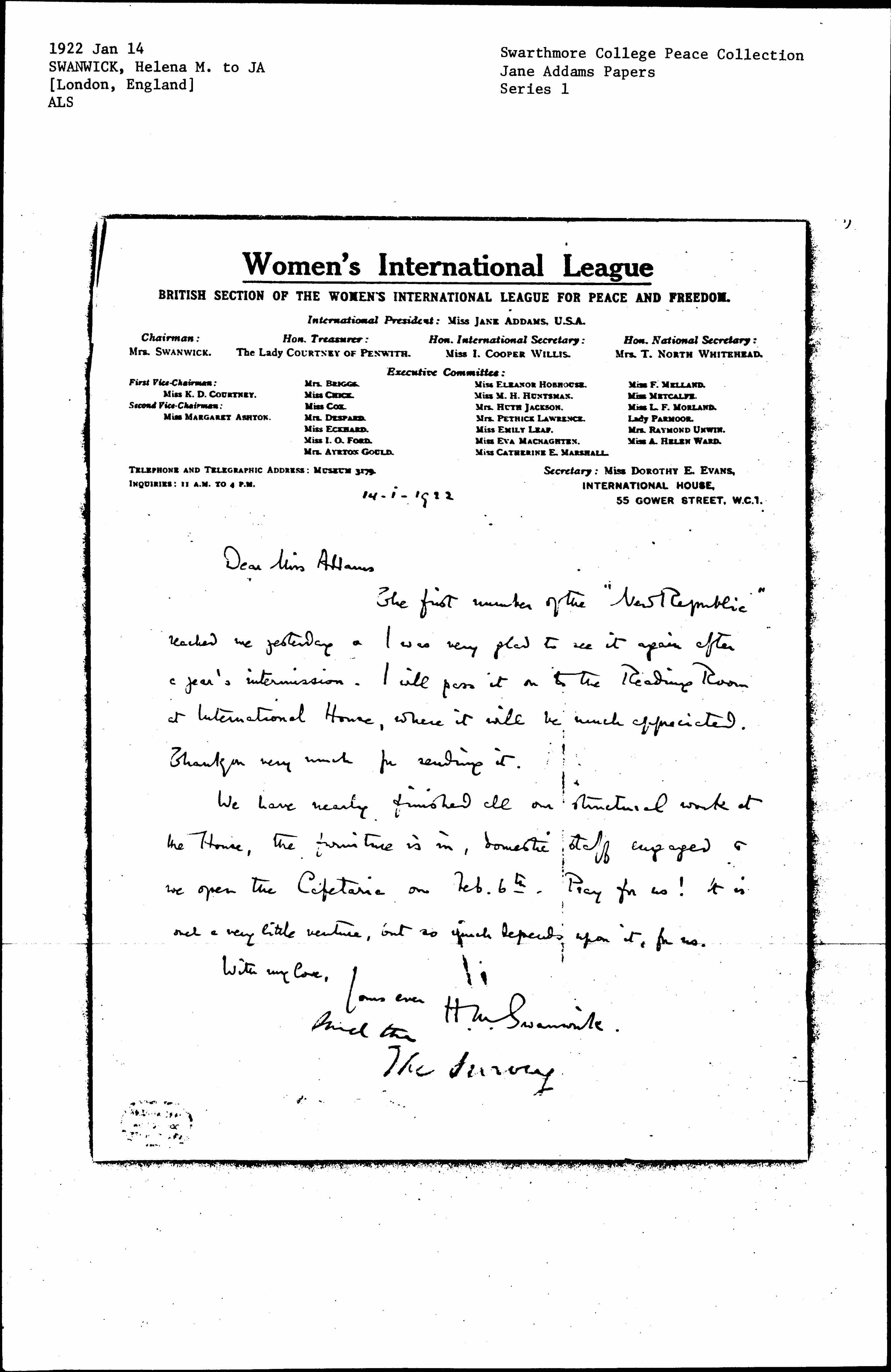The first number of the "New Republic" reached me yesterday & I was very glad to see it again after a year's intermission. I will pass it on to the Reading Room at International House, where it will be much appreciated. Thank you very much for sending it.