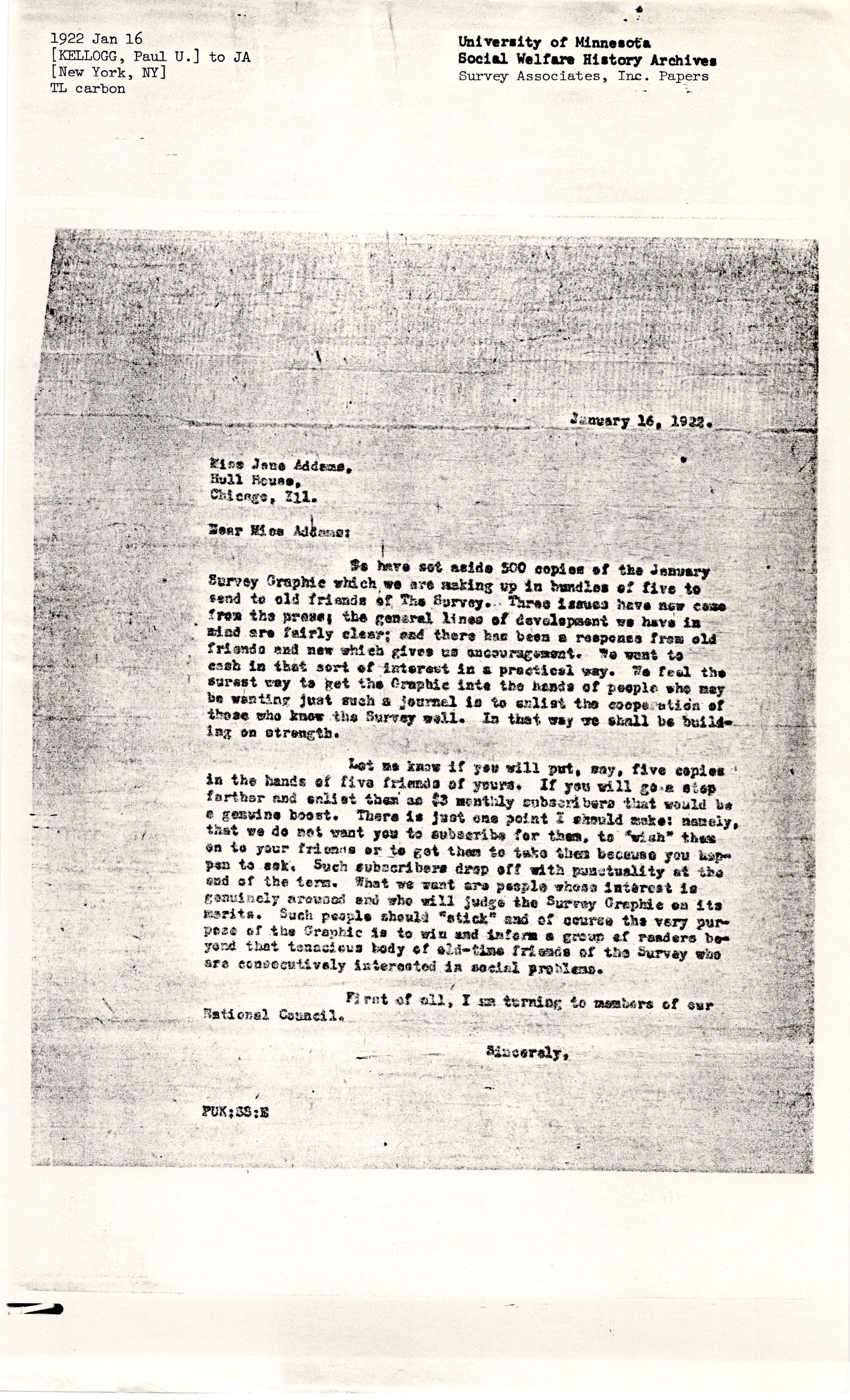 We have set aside 300 copies of the January Survey Graphic which we are making up in bundles of five to send to old friends of The Survey. Three issues have now come from the press; the general lines of development we have in mind are fairly clear; and there has been a response from old friends and new which gives is encouragement. We want to cash in that sort of interest in a practical way. We feel the surest way to get the Graphic into the hands of people who may be wanting just such a journal is to enlist the cooperation of those who know The Survey well. In that way we shall be building on strength.