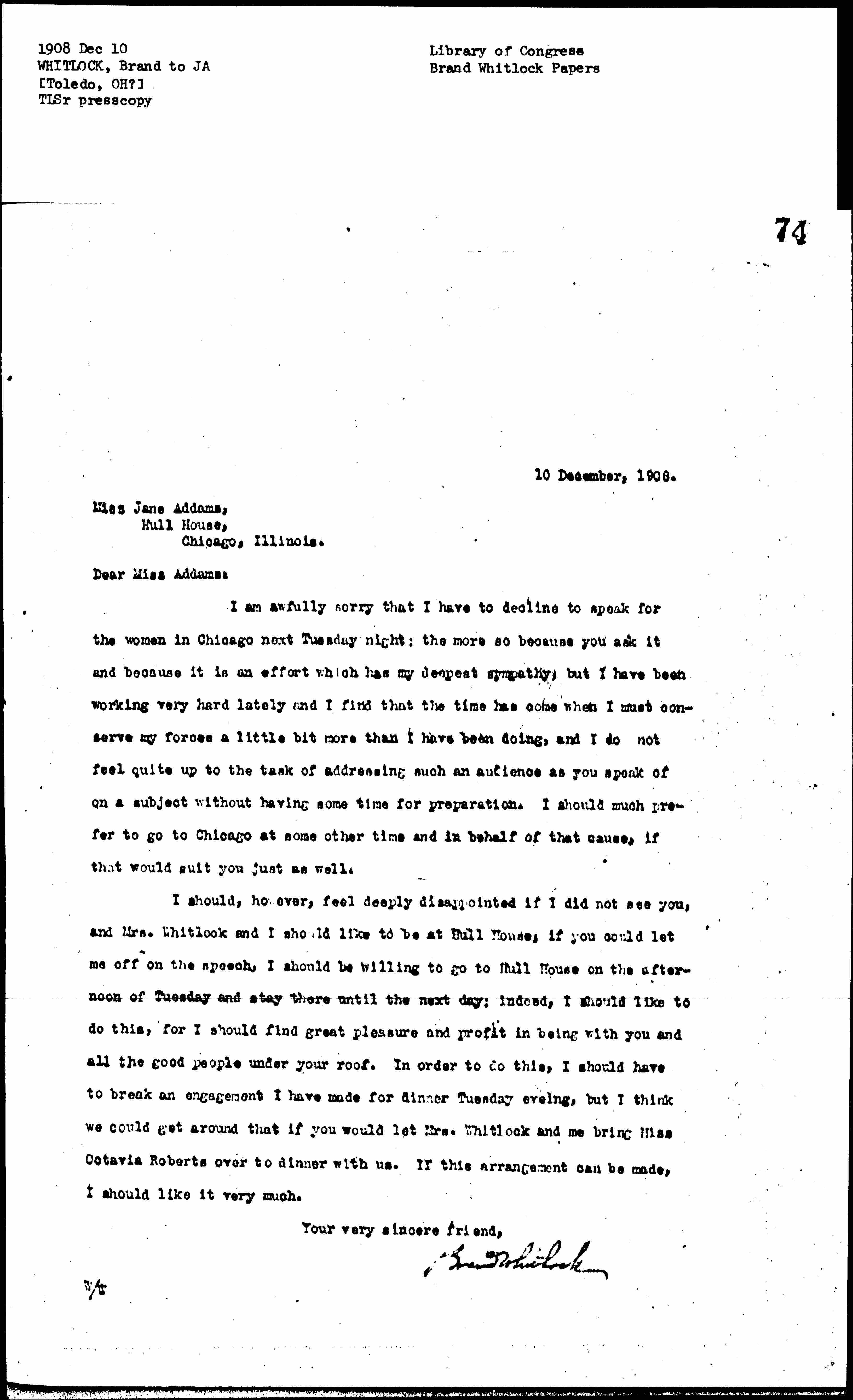 I should, however, feel deeply disappointed if I did not see you, and Mrs. Whitlock and I should like to be at Hull House, if you could let me off on the speech, I should be willing to go to Hull House on the afternoon of Tuesday and stay there until the next day; indeed, I should like to do this, for I should find great pleasure and profit in being with you and all the good people under your roof. In order to do this, I should have to break an engagement I have made for dinner Tuesday evening, but I think we could get around that if you would let Mrs. Whitlock and me bring Miss Octavia Roberts over to dinner with us, If this arrangement can be made, I should like it very much.