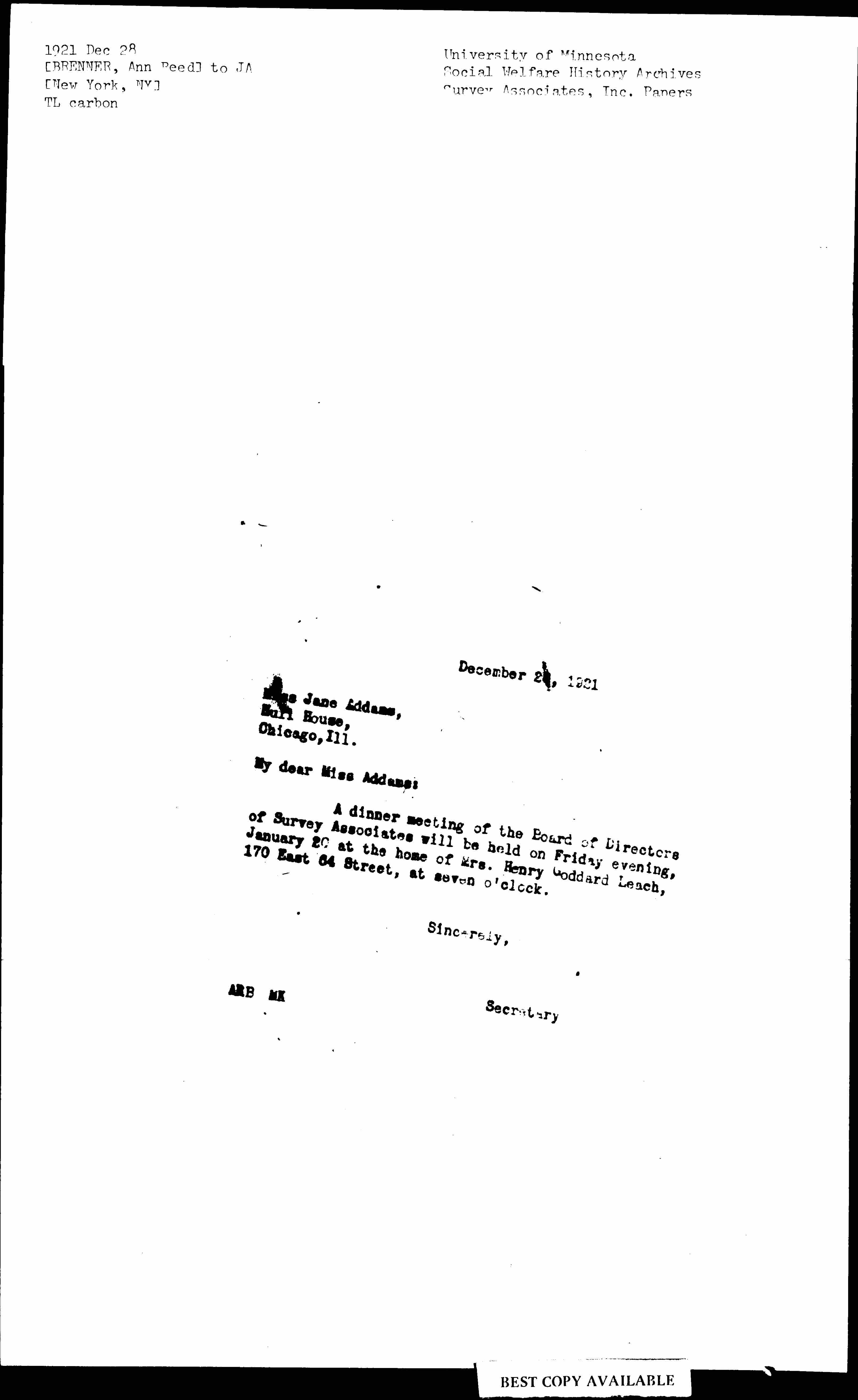 A dinner meeting of the Board of Directors of Survey Associates will be held on Friday evening, January 20 at the home of Mrs. Henry Goddard Leach, 170 East 64 Street, at seven o'clock.