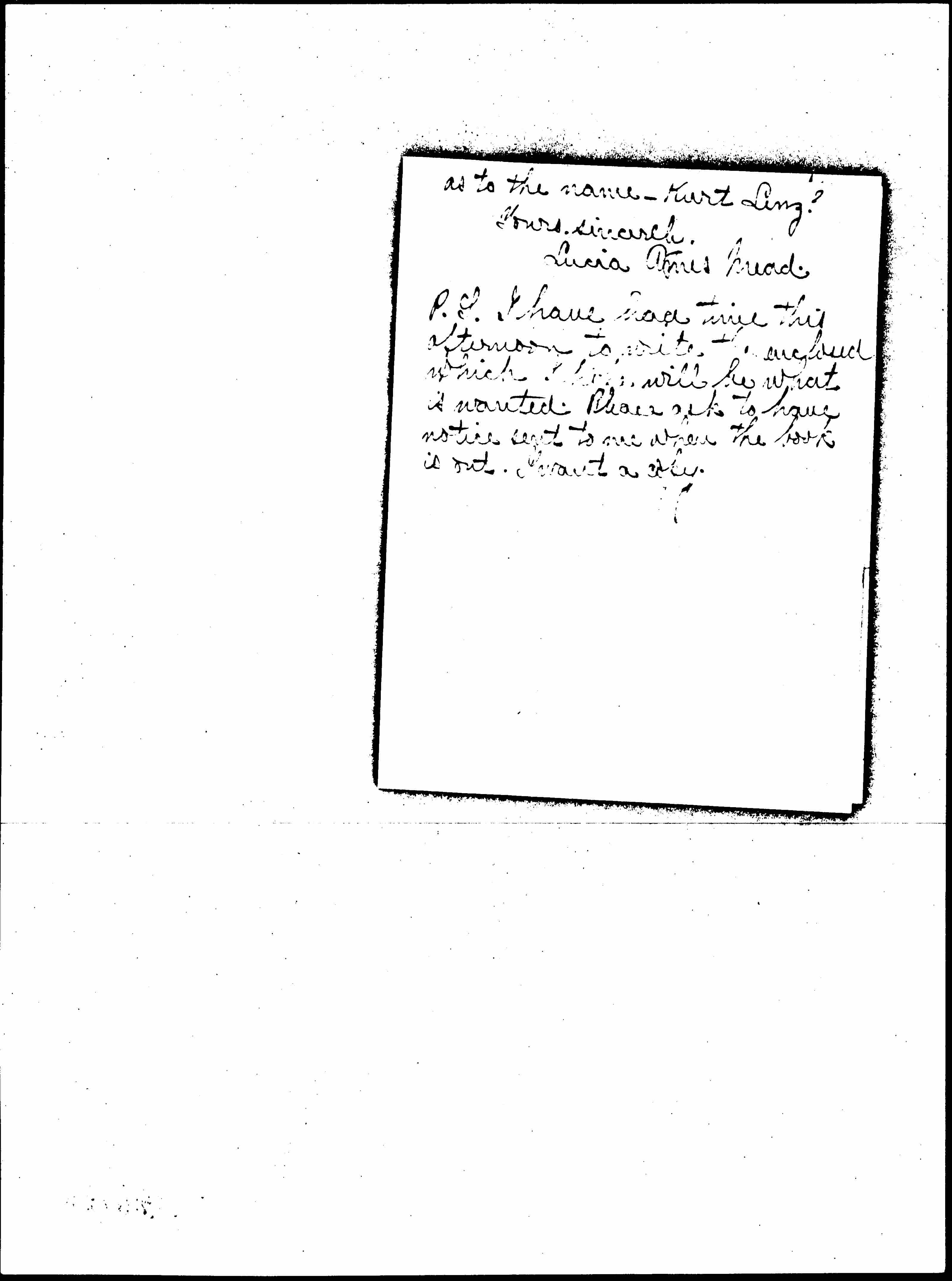I will try to send you in a very few days the material you desire written from my [point of view]. I was at Zurich with Miss Addams and with Fraulein [Heymann]. I will send the [matter] to you rather than to Berlin direct as I am not quite clear [page 2] as to the name -- Kurt Lenz?
