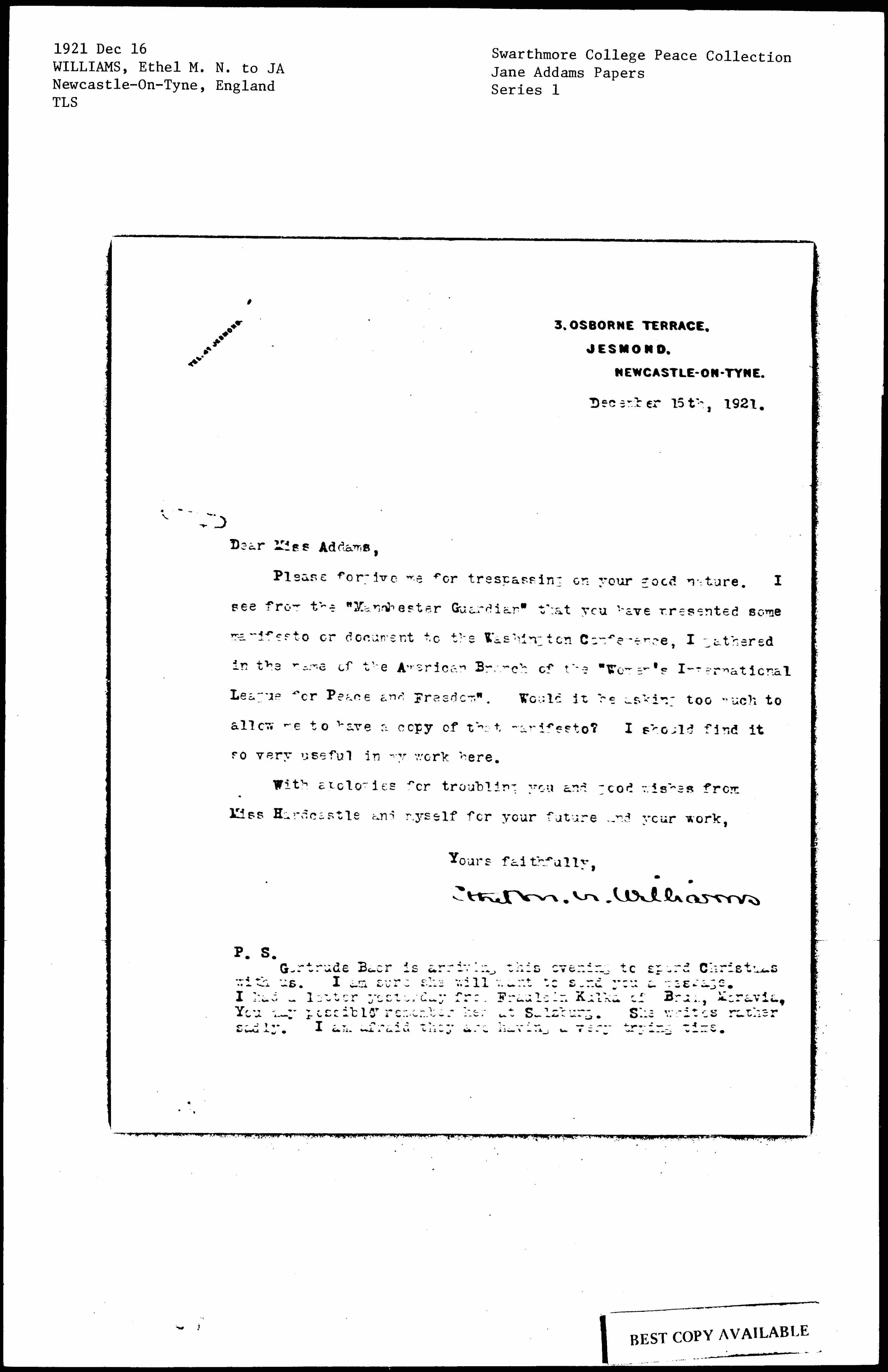 Please forgive me for trespassing on your good nature. I see from the "Manchester Guardian" that you have presented some manifesto or document to the Washington Conference, I gathered in the name of the American Branch of the "Women's International League for Peace and Freedom". Would it be asking too much to allow me to have a copy of that manifesto? I should find it so very useful in my work here.