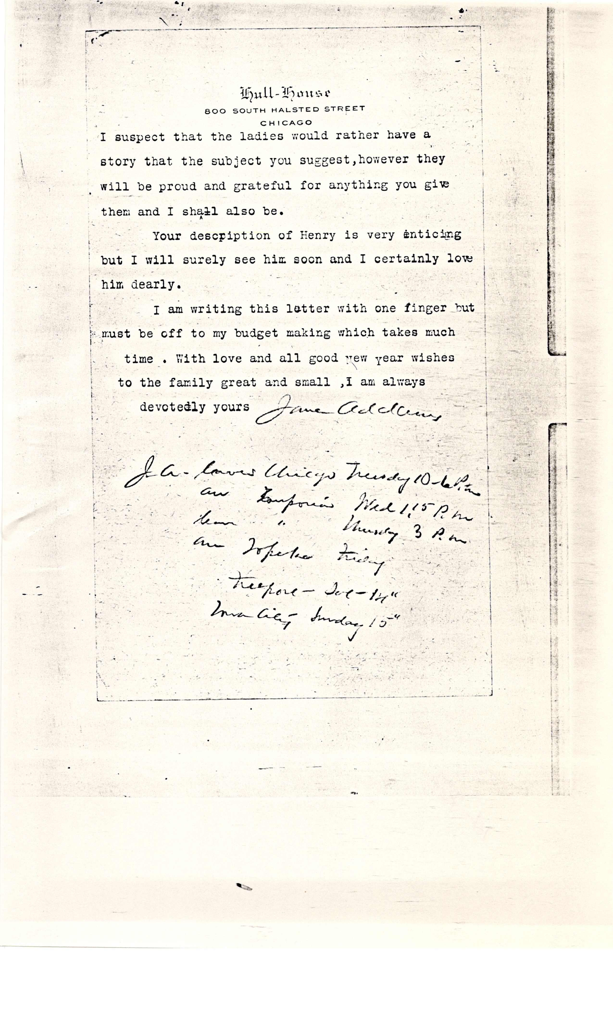 But alas for my chances of seeing Henry, I can't leave Chicago before the evening of the 10th and I must be in Freeport to speak to Flora's club Saturday afternoon the 14th at three o'clock, and at the State University of Iowa for vesper services the next day. This Topeka engagement was squeezed in through the efforts of an enthusiastic Kansan after by week was already quite full. Do come up to Emporia with as many members of the family as you can bring. I have accepted an invitation from the [Governor] Allen's for Topeka which must be short or I will never get to Freeport in time!